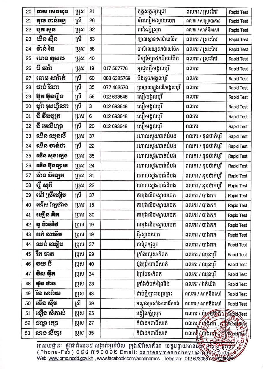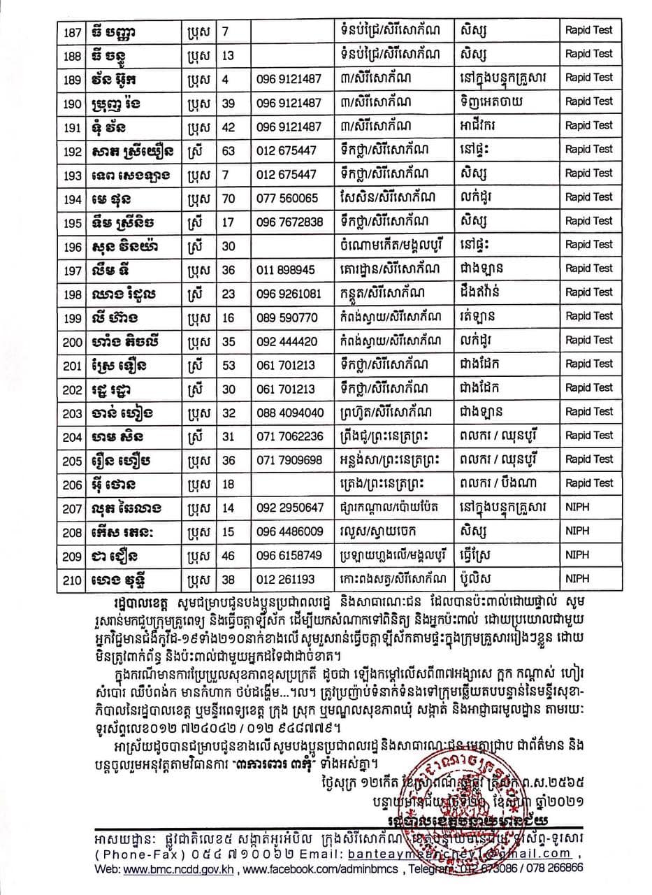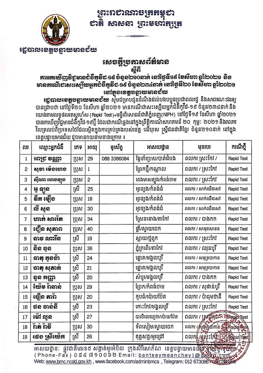 ខេត្តបន្ទាយមានជ័យ៖ យោងតាមសេចក្តីប្រកាសព័ត៌មានរបស់ រដ្ឋបាលខេត្តបន្ទាយមានជ័យ បន្តរកឃើញអ្នកវិជ្ជមានកូវីដ១៩ ចំនួន ២១០នាក់ និងមានអ្នកជាសះស្បើយចំនួន ២៣៤នាក់ នៅថ្ងៃទី២០ ខែសីហា ឆ្នាំ២០២១នេះ ដោយយោងតាមលទ្ធផលតេស្តរហ័ស (Rapid Test) មន្ទីរពិសោធន៍ជាតិភ្នំពេញ (NIPH) នៅថ្ងៃទី១៩ ខែសីហា ឆ្នាំ២០២១ បានរកឃើញវិជ្ជមានជំងឺកូវីដ-១៩ថ្មី ដែលជាករណីឆ្លងនៅក្នុងព្រឹត្តិការណ៍សហគមន៍ ២០ កុម្ភៈ ២០២១ និងពលករវិលត្រឡប់ពីប្រទេសថៃ ដែលស្ថិតនៅក្នុងគ្រប់គ្រងរបស់ខេត្ត លើបុរស ស្រ្តីជនជាតិខ្មែរ ចំនួន ២១០នាក់ នៅក្នុងខេត្តបន្ទាយមានជ័យ ដូចមានរាយនាមខាងក្រោម៖