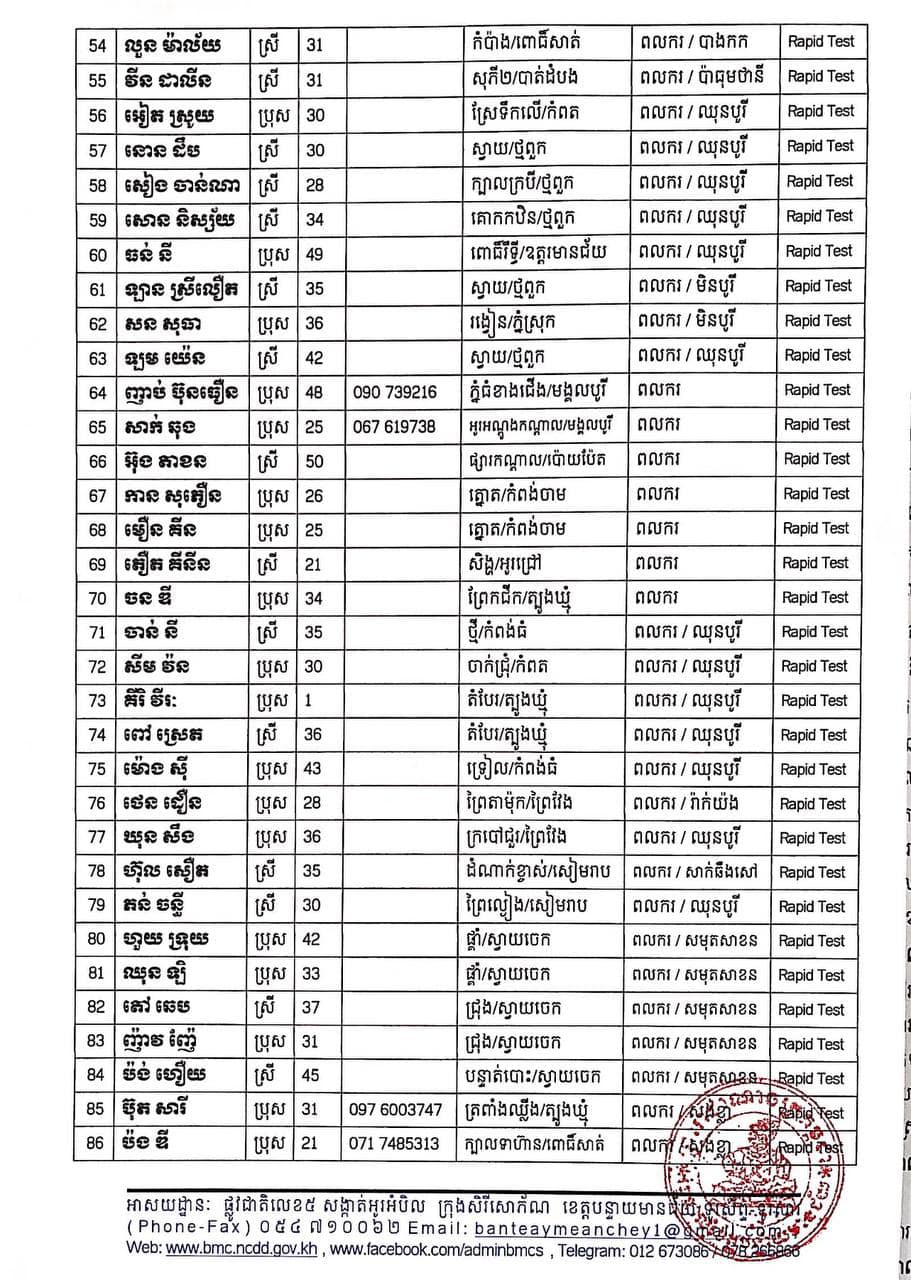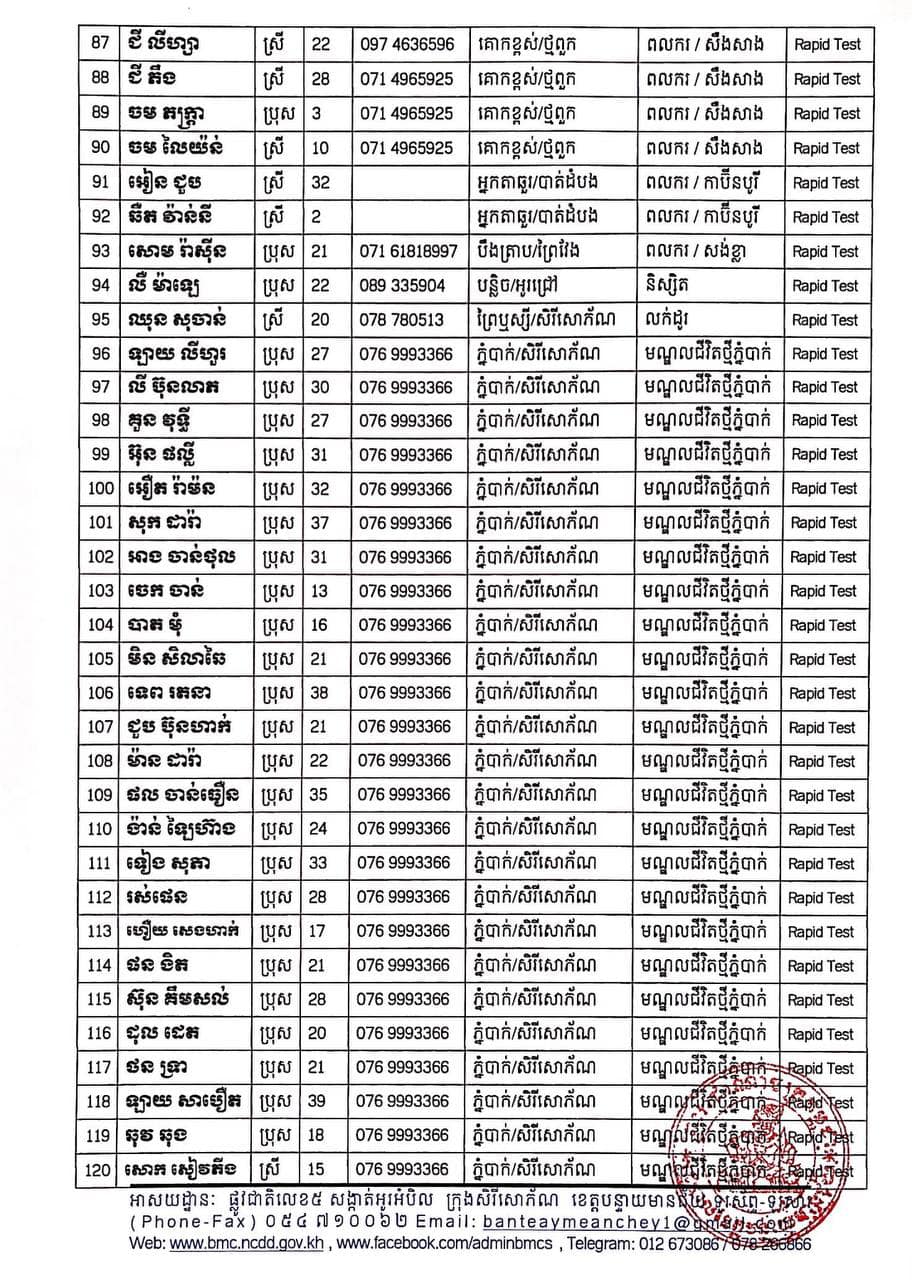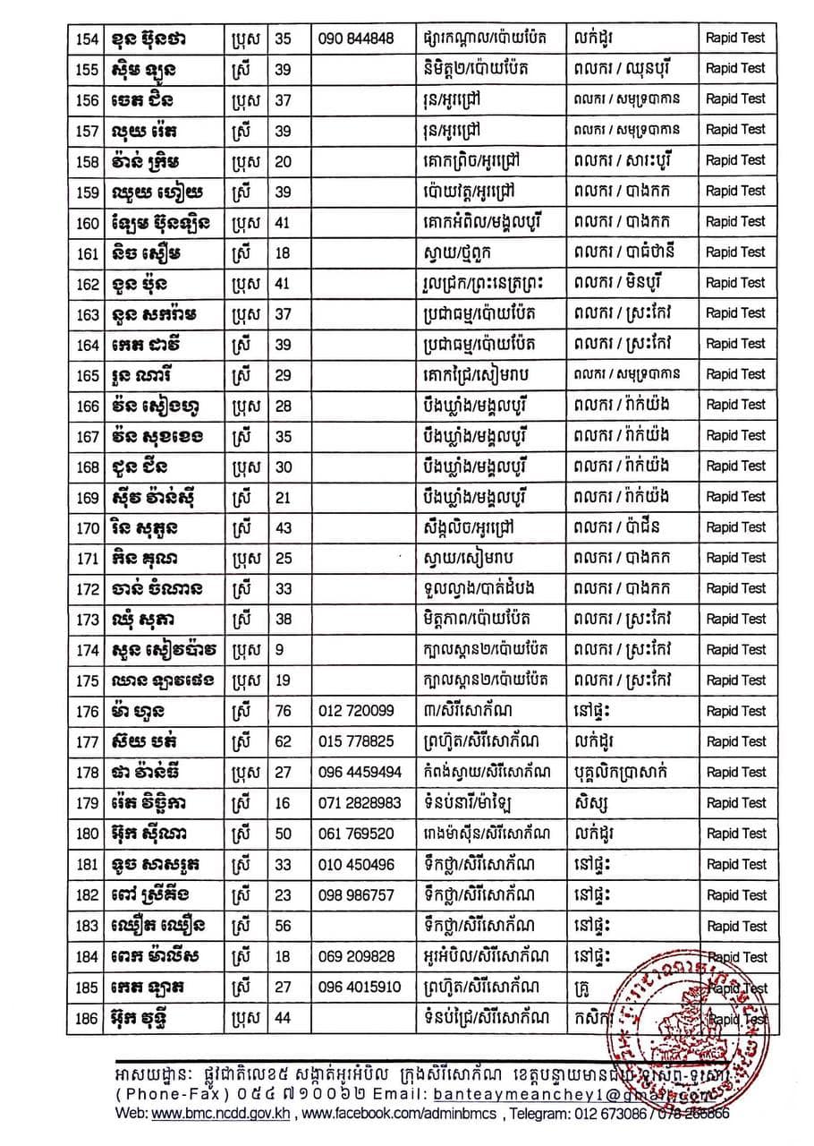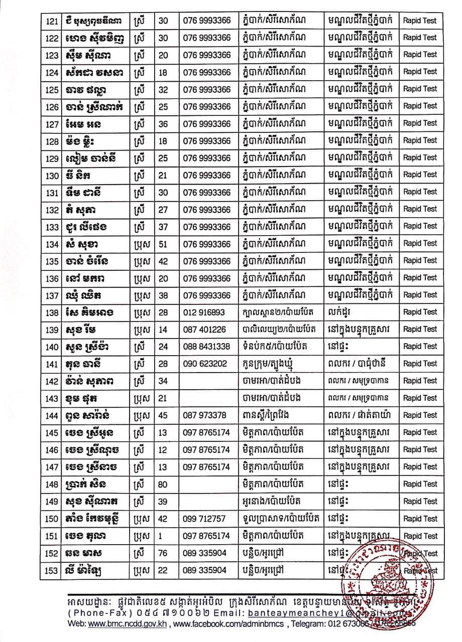 ខេត្តបន្ទាយមានជ័យ៖ យោងតាមសេចក្តីប្រកាសព័ត៌មានរបស់ រដ្ឋបាលខេត្តបន្ទាយមានជ័យ បន្តរកឃើញអ្នកវិជ្ជមានកូវីដ១៩ ចំនួន ២១០នាក់ និងមានអ្នកជាសះស្បើយចំនួន ២៣៤នាក់ នៅថ្ងៃទី២០ ខែសីហា ឆ្នាំ២០២១នេះ ដោយយោងតាមលទ្ធផលតេស្តរហ័ស (Rapid Test) មន្ទីរពិសោធន៍ជាតិភ្នំពេញ (NIPH) នៅថ្ងៃទី១៩ ខែសីហា ឆ្នាំ២០២១ បានរកឃើញវិជ្ជមានជំងឺកូវីដ-១៩ថ្មី ដែលជាករណីឆ្លងនៅក្នុងព្រឹត្តិការណ៍សហគមន៍ ២០ កុម្ភៈ ២០២១ និងពលករវិលត្រឡប់ពីប្រទេសថៃ ដែលស្ថិតនៅក្នុងគ្រប់គ្រងរបស់ខេត្ត លើបុរស ស្រ្តីជនជាតិខ្មែរ ចំនួន ២១០នាក់ នៅក្នុងខេត្តបន្ទាយមានជ័យ ដូចមានរាយនាមខាងក្រោម៖