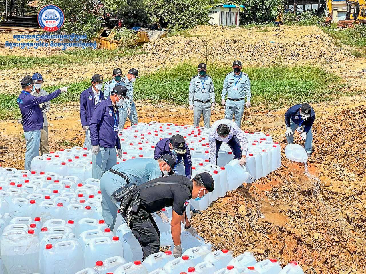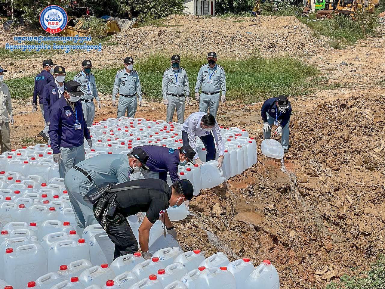 រាជធានីភំ្នពេញ៖ យោងតាមការចុះផ្សាយរបស់ អគ្គ.ការពារអ្នកប្រើប្រាស់ កិច្ចការប្រកួតប្រជែង និងបង្ក្រាបការក្លែងបន្លំ បានឲ្យដឹងថា នាថ្ងៃទី២០ ខែសីហា ឆ្នាំ២០២១ ដោយមានការឯកភាពពីស្ថាប័នអយ្យការអមសាលាដំបូងរាជធានីភ្នំពេញ អគ្គនាយកដ្ឋានការពារអ្នកប្រើប្រាស់ កិច្ចការប្រកួតប្រជែង និងបង្រ្កាបការក្លែងបន្លំ បានសហការជាមួយអាជ្ញាធរមូលដ្ឋានរបស់សាលាខណ្ឌដង្កោ បានធ្វើការកំទេចចោលអាល់កុលក្លែងក្លាយ (មេតាណុល) ចំនួន ៧០១ ប៊ីដុង ដែលស្មើនឹង ២១, ០៥២ លីត្រ ដែលបានមកពីការចាប់ និងដកហូតតាមបណ្ដាទីផ្សារកន្លងមក ស្ថិតនៅទីលានចាក់សំរាម ខណ្ឌដង្កោ រាជធានីភ្នំពេញ ៕