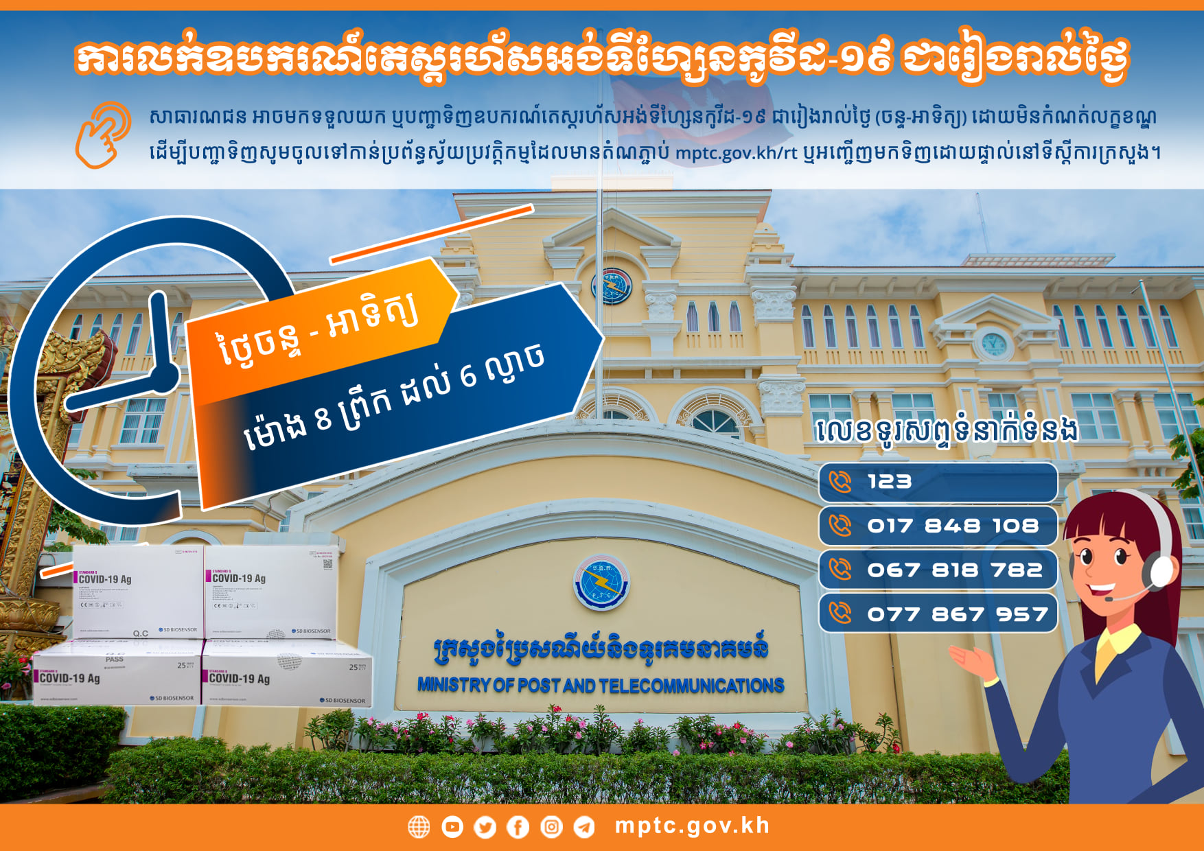 ក្រសួងប្រៃសណីយ៍ជូនដំណឹងដល់សាធារណជនទាំងអស់ អាចមកទទួលទិញឧបករណ៍តេស្តរហ័សអង់ទីហ្សែនកូវីដ-១៩ ជារៀងរាល់ថ្ងៃបាន ដោយមិនកំណត់លក្ខខណ្ឌ