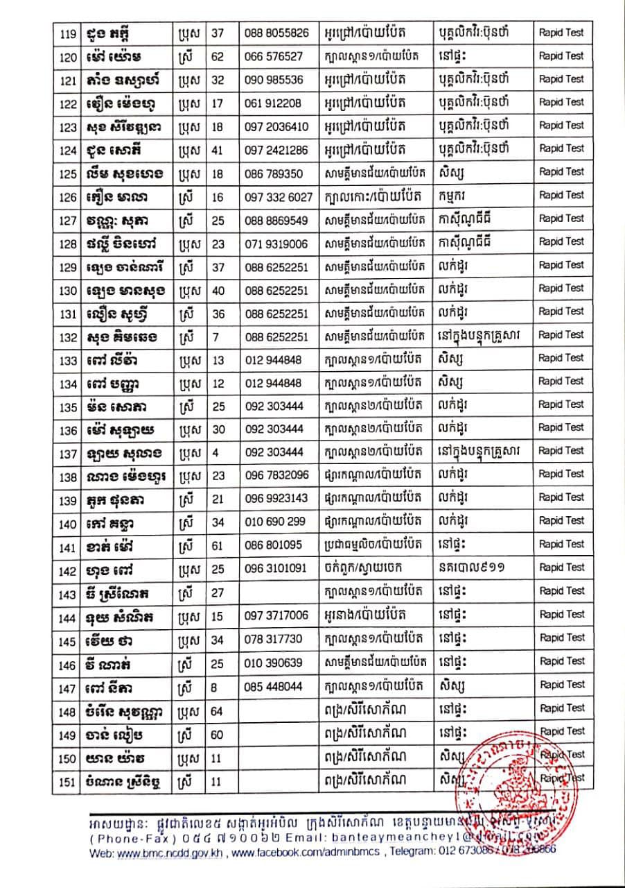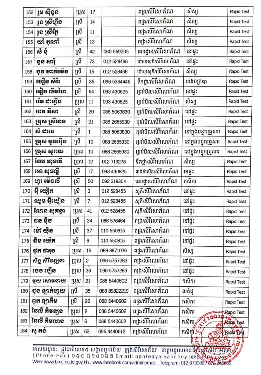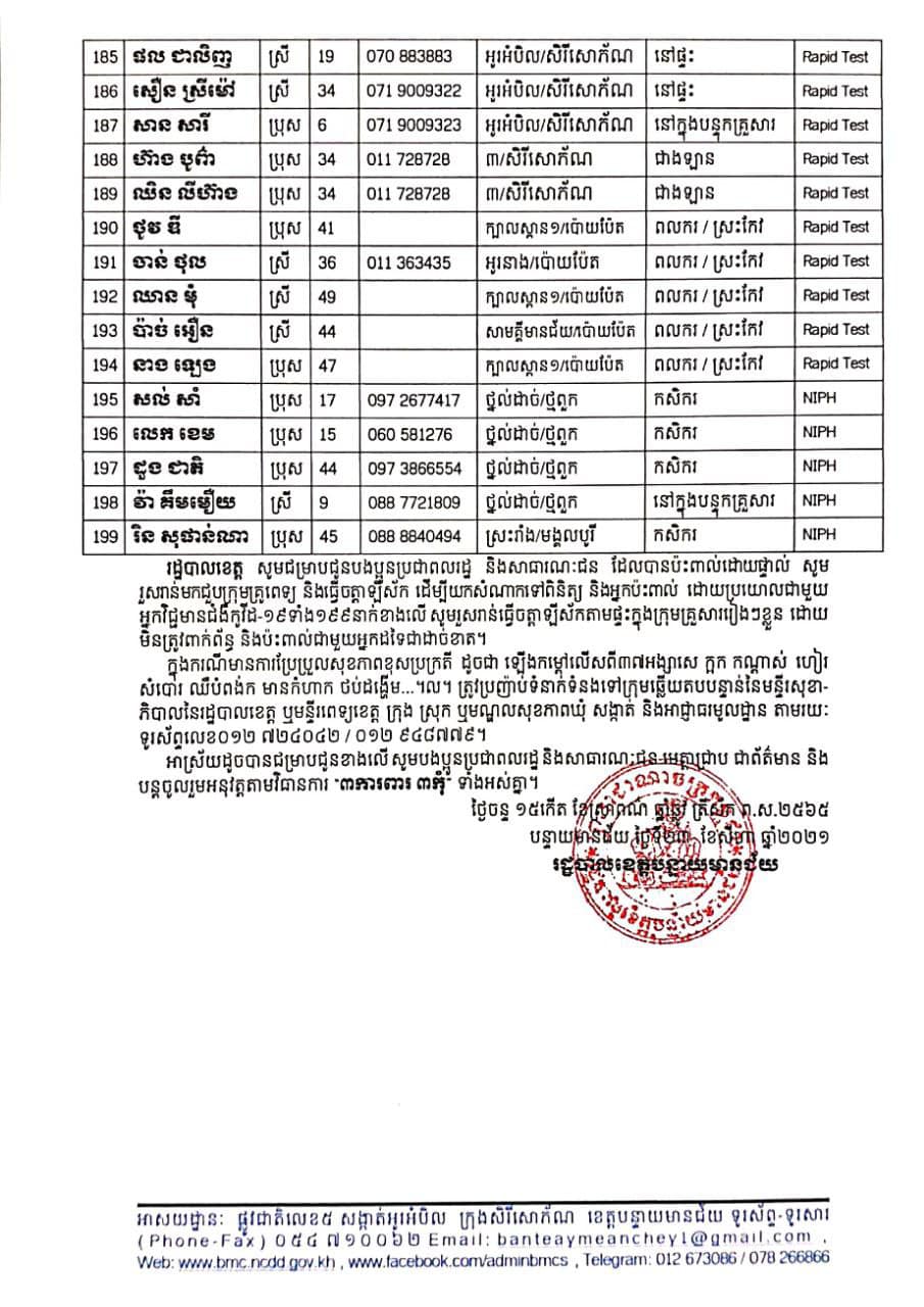 ខេត្តបន្ទាយមានជ័យ៖ យោងតាមសេចក្តីប្រកាសព័ត៌មានរបស់ រដ្ឋបាលខេត្តបន្ទាយមានជ័យ បន្តរកឃើញអ្នកវិជ្ជមានកូវីដ១៩ ចំនួន ១៩៩នាក់ និងមានអ្នកជាសះស្បើយចំនួន ១០៥នាក់ នៅថ្ងៃទី២៣ ខែសីហា ឆ្នាំ២០២១ ដោយយោងតាមលទ្ធផលតេស្តរហ័ស(Rapid Test) មន្ទីរពិសោធន៍ជាតិភ្នំពេញ (NIPH) នៅថ្ងៃទី២២ ខែសីហា ឆ្នាំ២០២១ បានរកឃើញវិជ្ជមានជំងឺកូវីដ-១៩ថ្មី ដែលជាករណីឆ្លងនៅក្នុងព្រឹត្តិការណ៍សហគមន៍ ២០ កុម្ភៈ ២០២១ និងពលករវិលត្រឡប់ពីប្រទេសថៃដែលស្ថិតនៅក្នុងការគ្រប់គ្រងរបស់ខេត្ត លើបុរស ស្រ្តីជនជាតិខ្មែរ ចំនួន ១៩៩នាក់ នៅក្នុងខេត្តបន្ទាយមានជ័យ ដូចមានរាយនាមខាងក្រោម៖