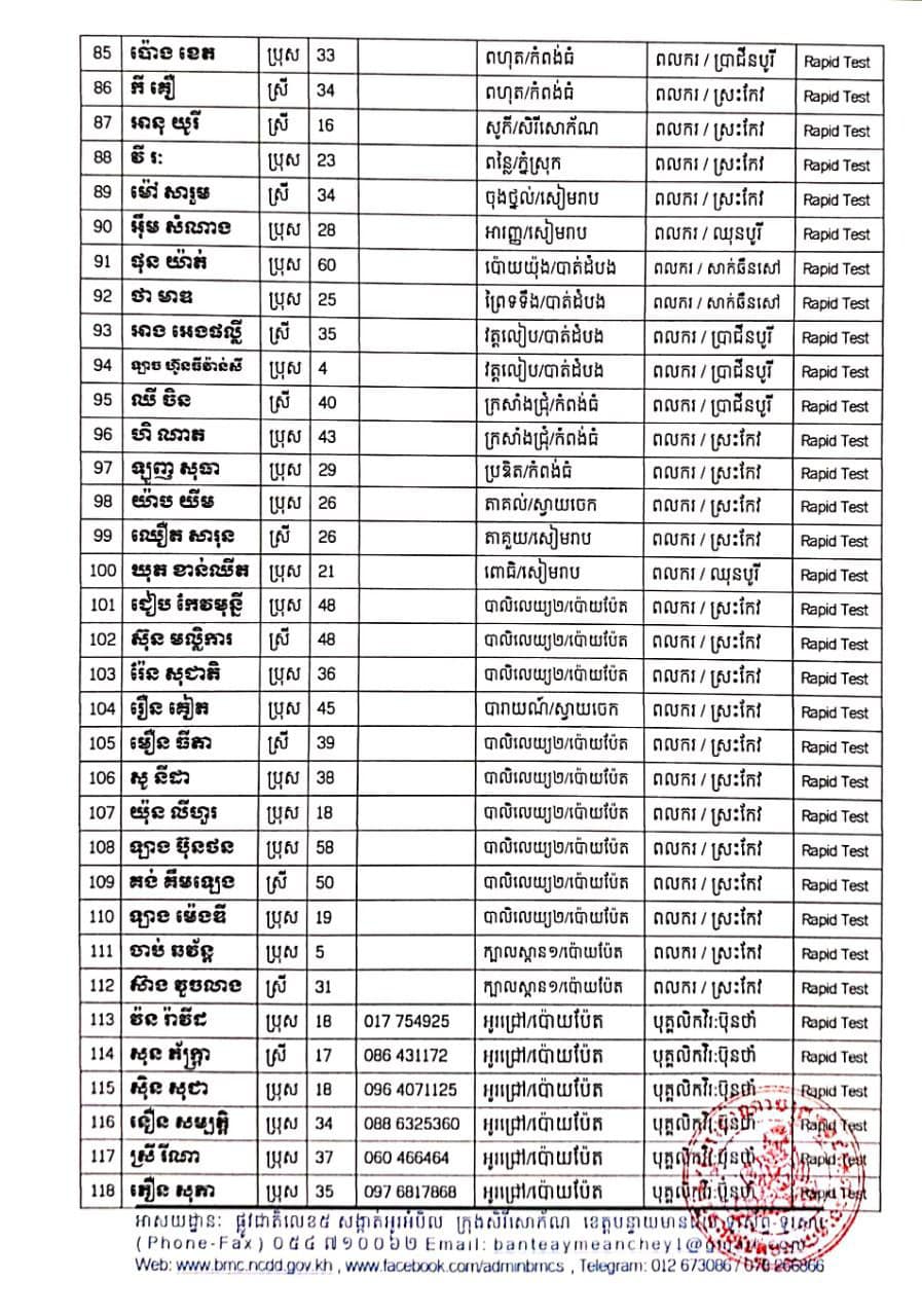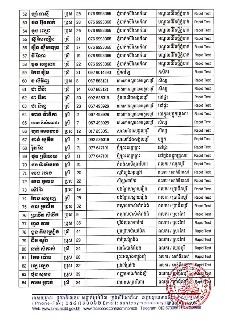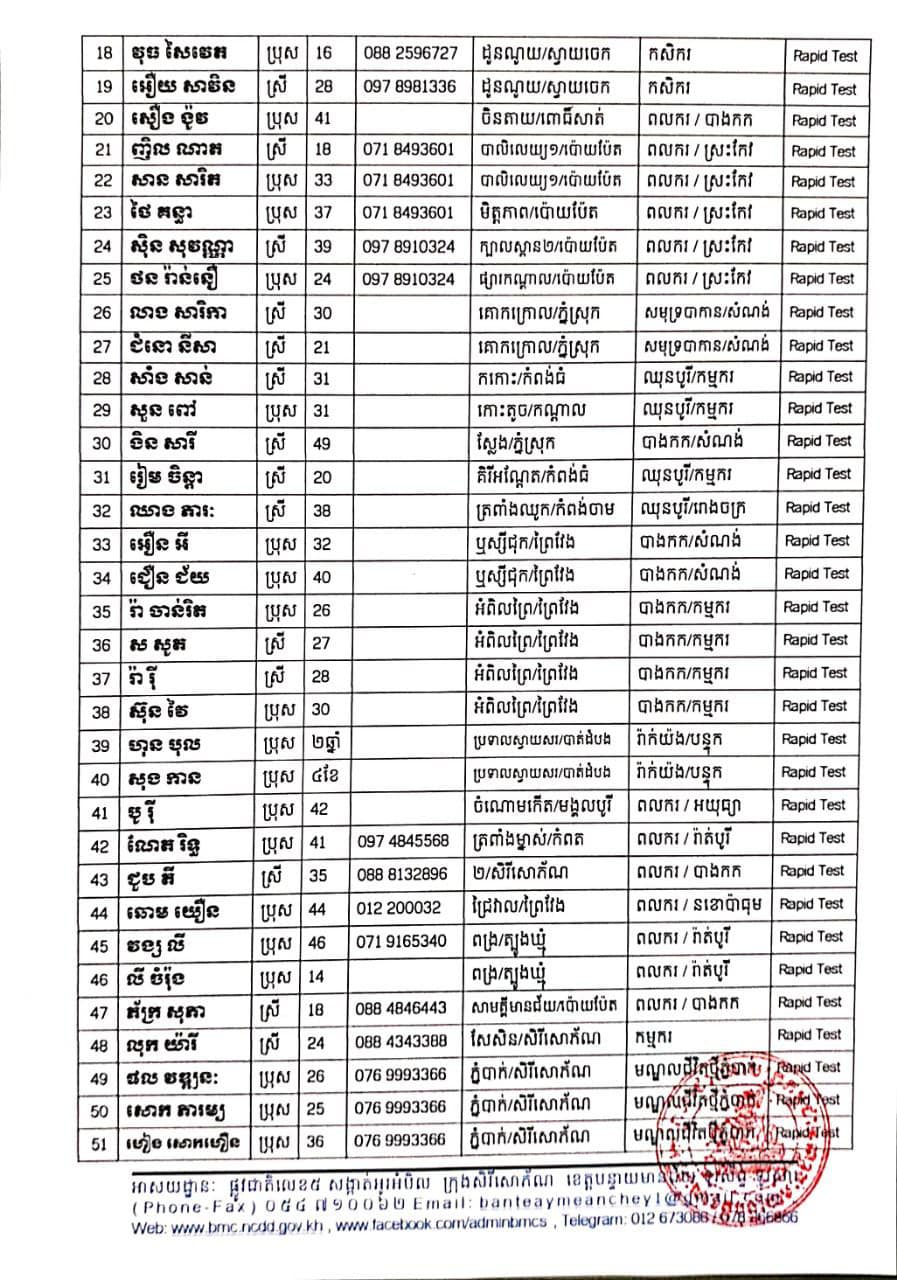 ខេត្តបន្ទាយមានជ័យ៖ យោងតាមសេចក្តីប្រកាសព័ត៌មានរបស់ រដ្ឋបាលខេត្តបន្ទាយមានជ័យ បន្តរកឃើញអ្នកវិជ្ជមានកូវីដ១៩ ចំនួន ១៩៩នាក់ និងមានអ្នកជាសះស្បើយចំនួន ១០៥នាក់ នៅថ្ងៃទី២៣ ខែសីហា ឆ្នាំ២០២១ ដោយយោងតាមលទ្ធផលតេស្តរហ័ស(Rapid Test) មន្ទីរពិសោធន៍ជាតិភ្នំពេញ (NIPH) នៅថ្ងៃទី២២ ខែសីហា ឆ្នាំ២០២១ បានរកឃើញវិជ្ជមានជំងឺកូវីដ-១៩ថ្មី ដែលជាករណីឆ្លងនៅក្នុងព្រឹត្តិការណ៍សហគមន៍ ២០ កុម្ភៈ ២០២១ និងពលករវិលត្រឡប់ពីប្រទេសថៃដែលស្ថិតនៅក្នុងការគ្រប់គ្រងរបស់ខេត្ត លើបុរស ស្រ្តីជនជាតិខ្មែរ ចំនួន ១៩៩នាក់ នៅក្នុងខេត្តបន្ទាយមានជ័យ ដូចមានរាយនាមខាងក្រោម៖