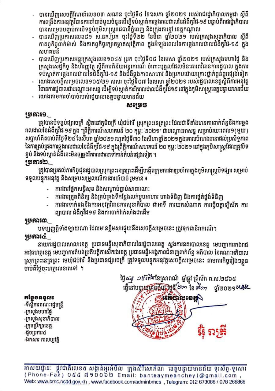 រដ្ឋបាលខេត្តបន្ទាយមានជ័យ សម្រេចបិទខ្ទប់ផ្សារចក្រី ដែលពាក់ព័ន្ធនឹងការឆ្លងរាលដាលជំងឺកូវីដ-១៩ រយៈពេល ១សប្តាហ៍