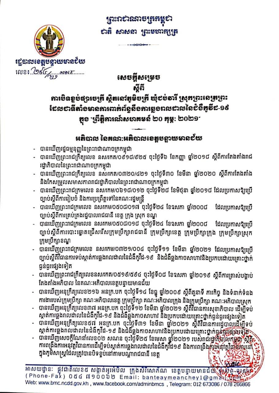 យោងតាមលិខិតរបស់ រដ្ឋបាលខេត្តបន្ទាយមានជ័យ ចេញសេចក្តីសម្រេចបិទខ្ទប់ផ្សារចក្រី ក្នុងភូមិចក្រី ឃុំជប់វារី ស្រុកព្រះនេត្រព្រះ ដែលជាទីតាំងមានជាប់ពាក់ព័ន្ធនឹងការឆ្លងរាលដាលនៃជំងឺកូវីដ១៩ ក្នុង “ព្រឹត្តិការណ៍សហគមន៍ ២០ កុម្ភៈ ២០២១” ជាបណ្តោះអាសន្នសម្រាប់រយៈពេល ១សប្តាហ៍ គិតចាប់ពីថ្ងៃទី២៤ ខែសីហា ឆ្នាំ២០២១ រហូតដល់ថ្ងៃទី៣០ ខែសីហា ឆ្នាំ២០២១ ក្នុងគោលបំណងធានាដល់ប្រសិទ្ធភាពនៃការគ្រប់គ្រងការឆ្លងរាលដាលនៃជំងឺកូវីដ-១៩ ក្នុង “ព្រឹត្តិការណ៍សហគមន៍ ២០ កុម្ភៈ ២០២១” នៅក្នុងភូមិសាស្ត្រដែលត្រូវបិទខ្ទប់ និងទប់ស្កាត់ជំងឺនេះមិនឲ្យឆ្លងរីករាលដាលទៅកាន់តំបន់ផ្សេងទៀត៕