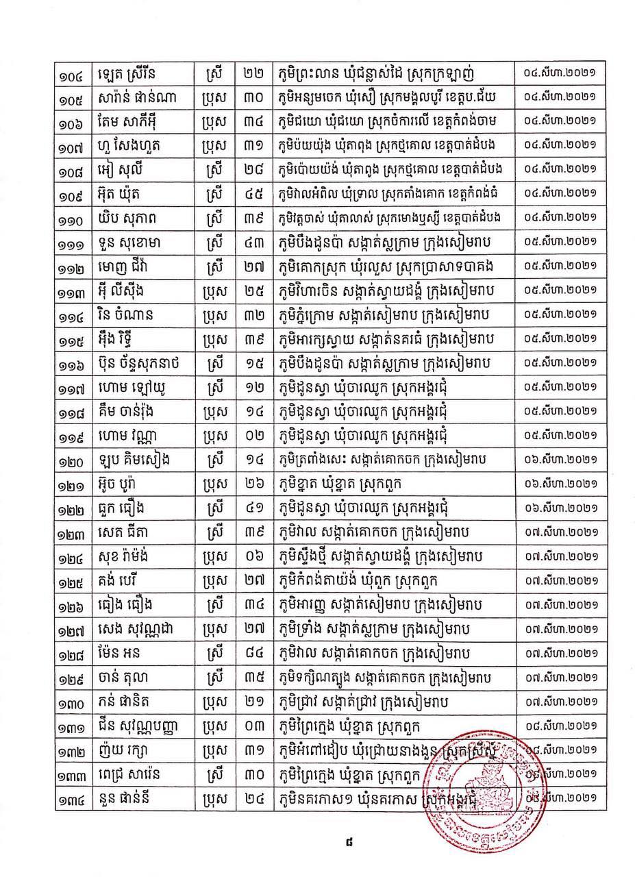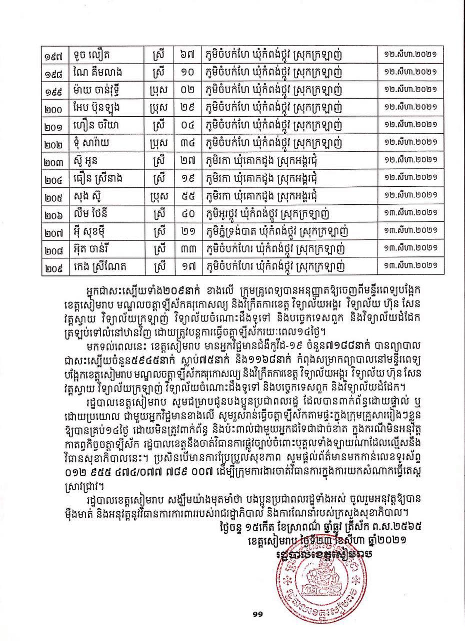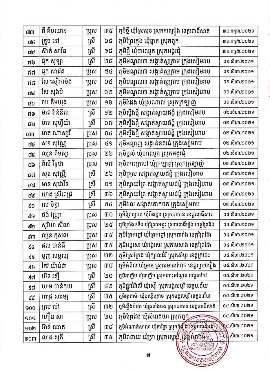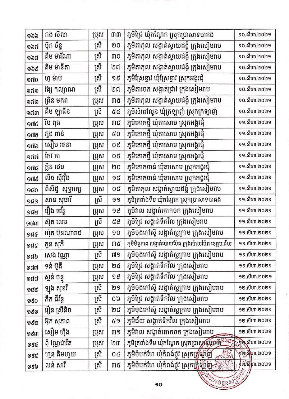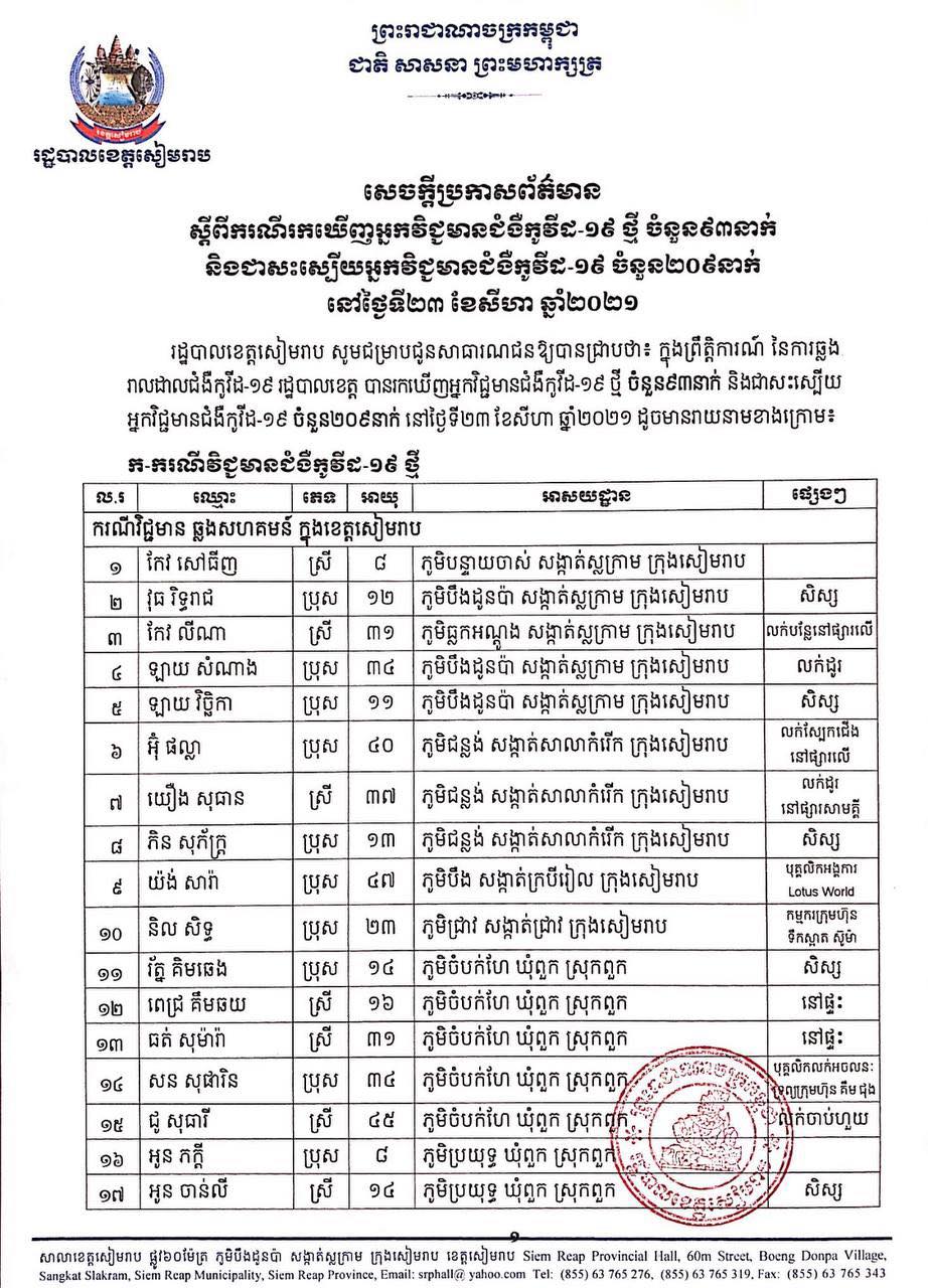 ខេត្តសៀមរាប៖ យោងតាមសេចក្ដីប្រកាសព័ត៌មានរបស់ រដ្ឋបាលខេត្តសៀមរាប សូមជម្រាបជូនសាធារណជនឱ្យបានជ្រាបថា៖ ក្នុងព្រឹត្តិការណ៍ នៃការឆ្លងរាលដាលជំងឺកូវីដ-១៩ រដ្ឋបាលខេត្ត បានរកឃើញអ្នកវិជ្ជមានជំងឺកូវីដ-១៩ថ្មី ចំនួន ៩៣នាក់ និងជាសះស្បើយអ្នកវិជ្ជមានជំងឺកូវីដ-១៩ ចំនួន ២០៩នាក់ នៅថ្ងៃទី២៣ ខែសីហា ឆ្នាំ២០២១ ដូចមានរាយនាមខាងក្រោម៖
