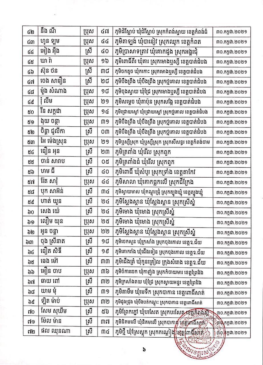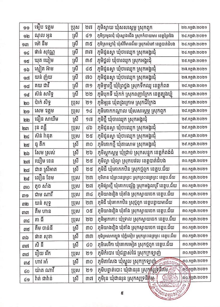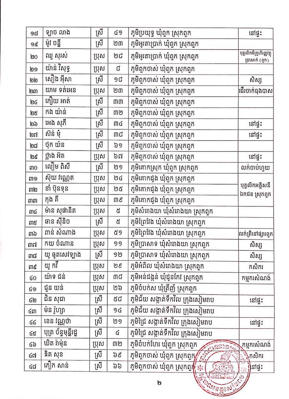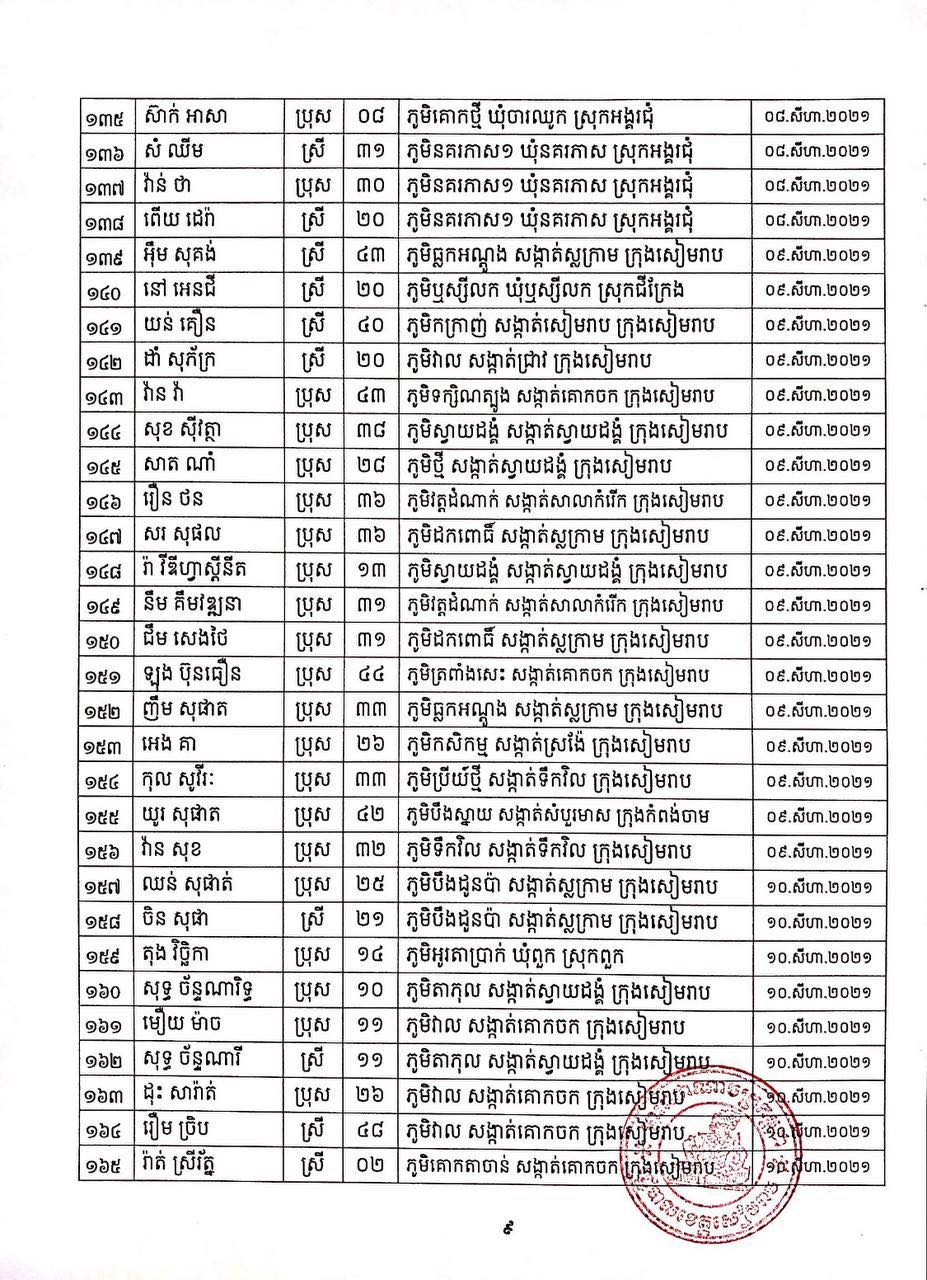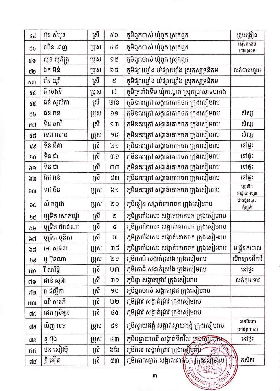 ខេត្តសៀមរាប៖ យោងតាមសេចក្ដីប្រកាសព័ត៌មានរបស់ រដ្ឋបាលខេត្តសៀមរាប សូមជម្រាបជូនសាធារណជនឱ្យបានជ្រាបថា៖ ក្នុងព្រឹត្តិការណ៍ នៃការឆ្លងរាលដាលជំងឺកូវីដ-១៩ រដ្ឋបាលខេត្ត បានរកឃើញអ្នកវិជ្ជមានជំងឺកូវីដ-១៩ថ្មី ចំនួន ៩៣នាក់ និងជាសះស្បើយអ្នកវិជ្ជមានជំងឺកូវីដ-១៩ ចំនួន ២០៩នាក់ នៅថ្ងៃទី២៣ ខែសីហា ឆ្នាំ២០២១ ដូចមានរាយនាមខាងក្រោម៖
