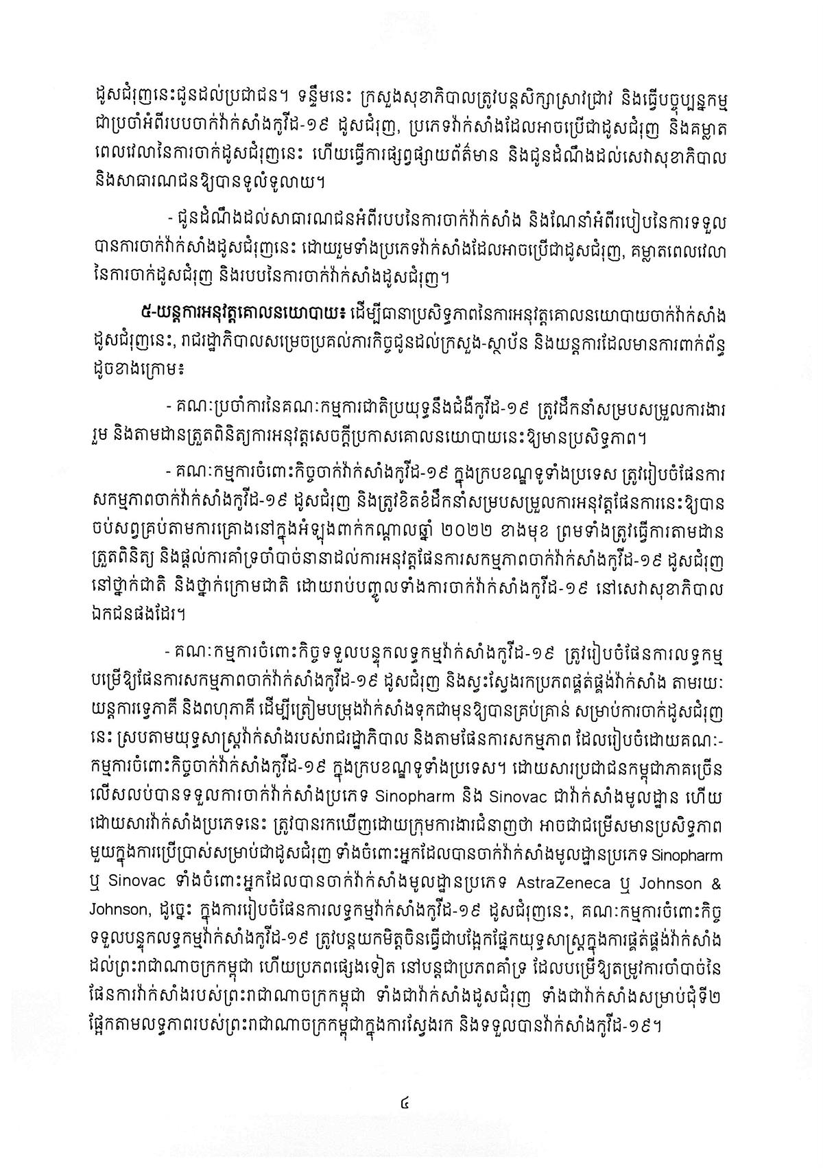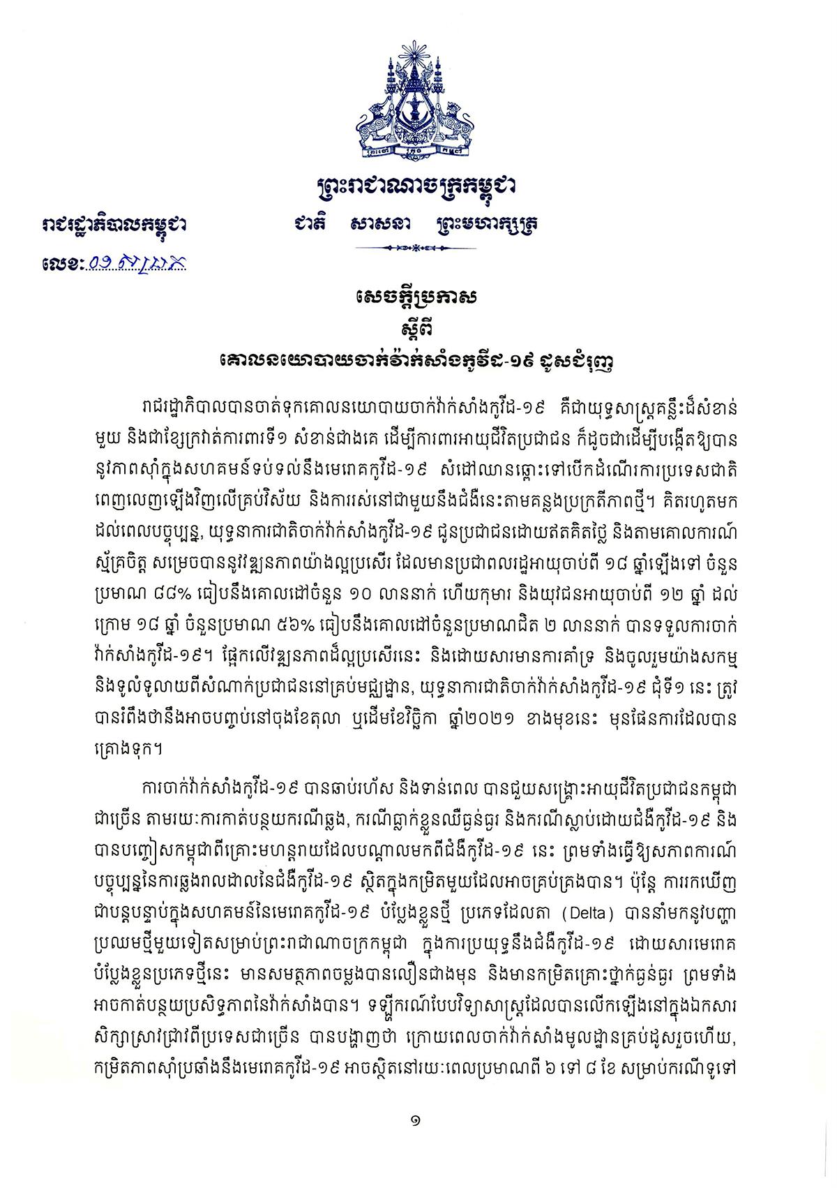 រាជធានីភ្នំពេញ៖ នៅព្រឹកថ្ងៃទី២៥ ខែសីហា ឆ្នាំ២០២១នេះ រាជរដ្ឋាភិបាលកម្ពុជា បានសម្រេចដាក់ចេញនូវគោលនយោបាយចាក់វ៉ាក់សាំងកូវីដ១៩ ដូសជំរុញ។ ក្នុងសេចក្តីប្រកាសព័ត៌មានបានបញ្ជាក់ថា ការចាក់ដូសជំរុញសម្រាប់ប្រជាពលរដ្ឋអាយុចាប់ពី ១២ឆ្នាំឡើងទៅ នឹងធ្វើឡើងចាប់ពីខែសីហា ឆ្នាំ២០២១នេះ ដល់អំឡុងពាក់កណ្តាលឆ្នាំ២០២២ ដោយអាស្រ័យលើលទ្ធភាពនៃការស្វែងរក និងទទួលបានវ៉ាក់សាំងកូវីដ១៩។ សូមអានព័ត៌មានលំអិតខាងក្រោម៖