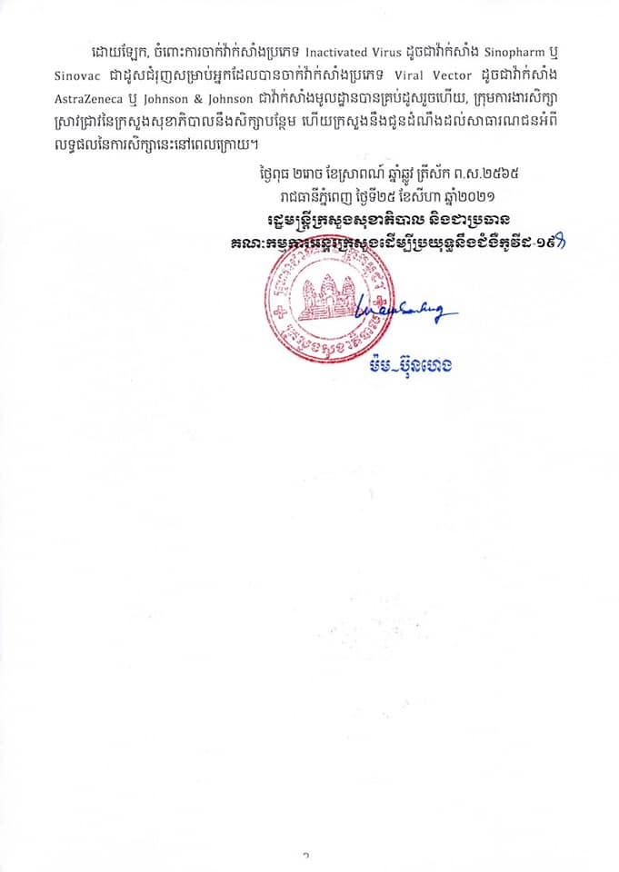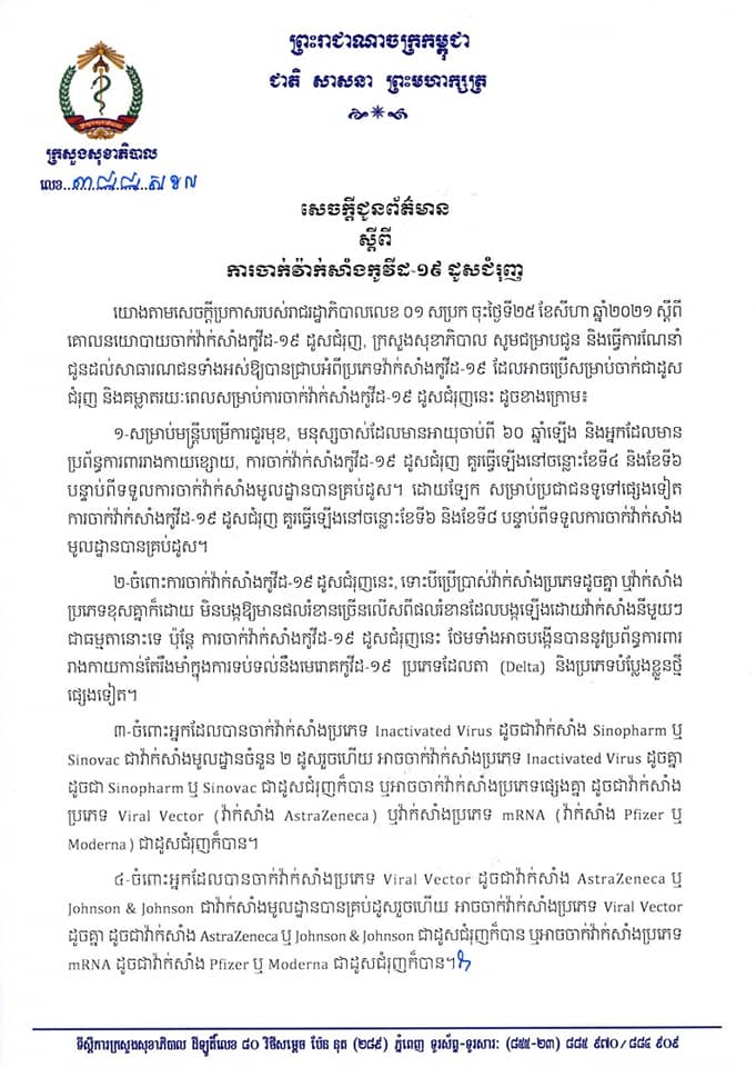 ក្រសួងសុខាភិបាល បញ្ជាក់លំអិតអំពីប្រភេទវ៉ាក់សាំង ដែលអាចប្រើសម្រាប់ចាក់ជាដូសជំរុញ និងគម្លាតរយៈពេលនៃការចាក់ដូសជំរុញ
