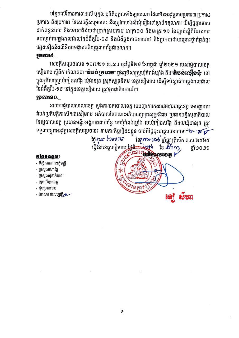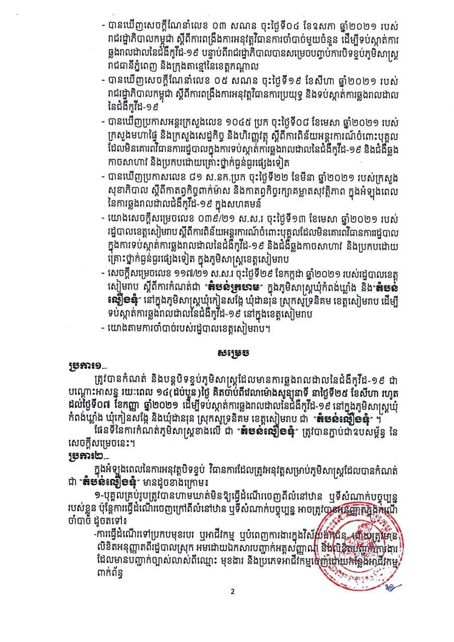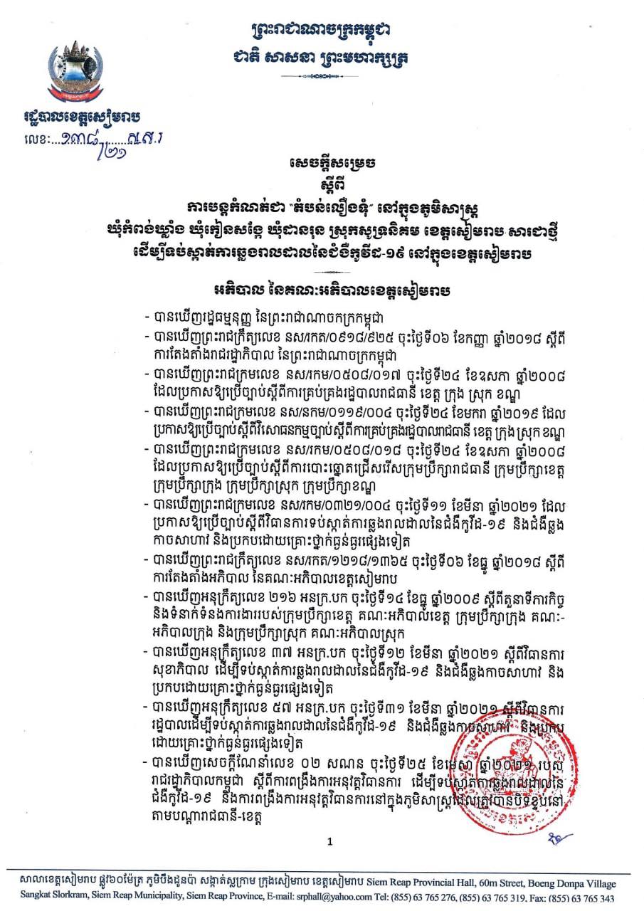 រដ្ឋបាលខេត្តសម្រេចបន្តកំណត់ជា និងបិទខ្ទប់ភូមិសាស្ត្រដែលមានការឆ្លងរាលដាលនៃជំងឺកូវីដ-១៩ ជាបណ្តោះអាសន្ន រយៈពេល ១៤(ដប់បួន)ថ្ងៃ គិតចាប់ពីវេលាម៉ោងសូន្យនាទី នាថ្ងៃទី២៥ ខែសីហា រហូត ដល់ថ្ងៃទី០៧ ខែកញ្ញា ឆ្នាំ២០២១ ដើម្បីទប់ស្កាត់ការឆ្លងរាលដាលនៃជំងឺកូវីដ-១៩ នៅក្នុងភូមិសាស្ត្រឃុំកំពង់ឃ្លាំង ឃុំកៀនសង្កែ ឃុំដានរុន ស្រុកសូទនិគម ខេត្តសៀមរាប ជា”តំបន់លឿងទុំ”៕