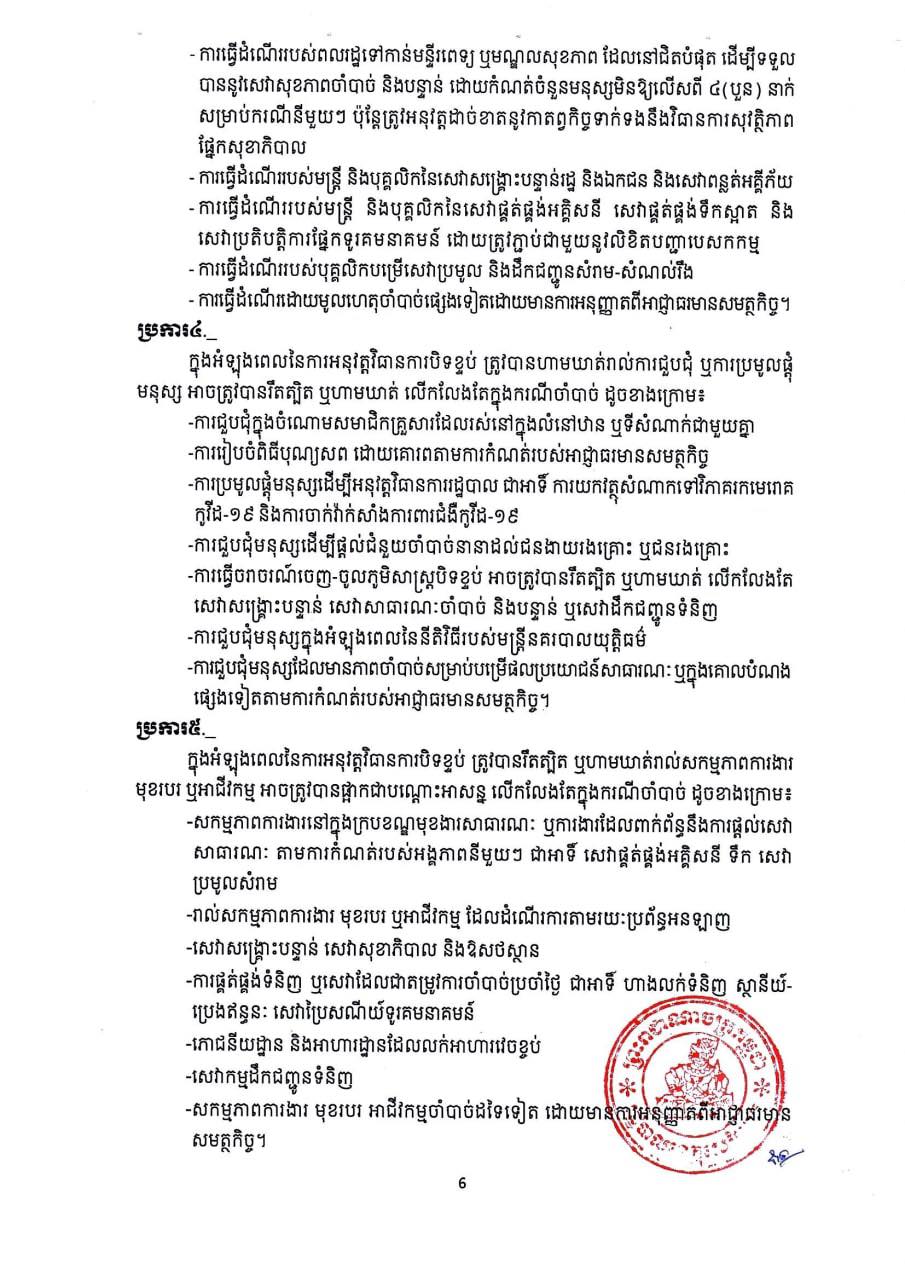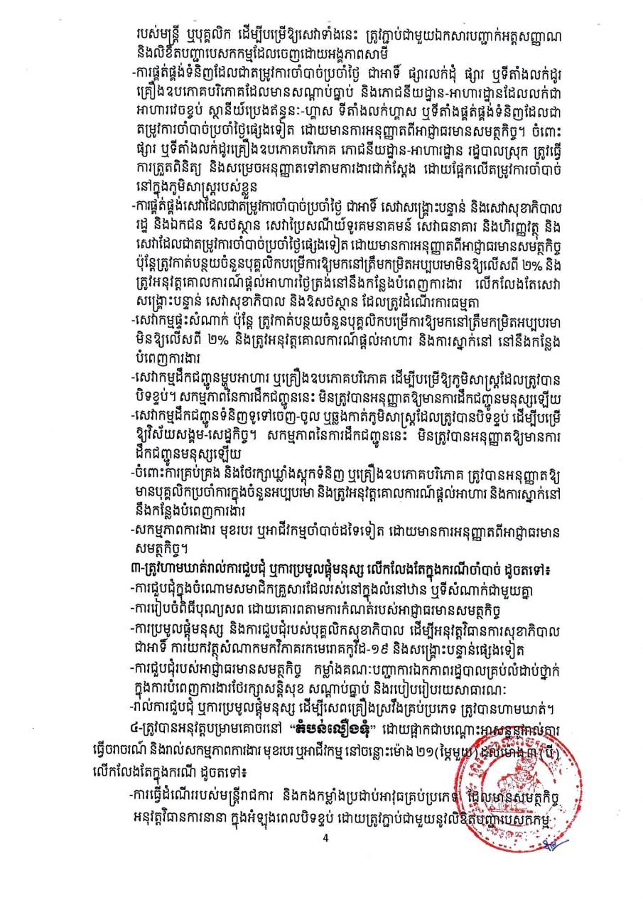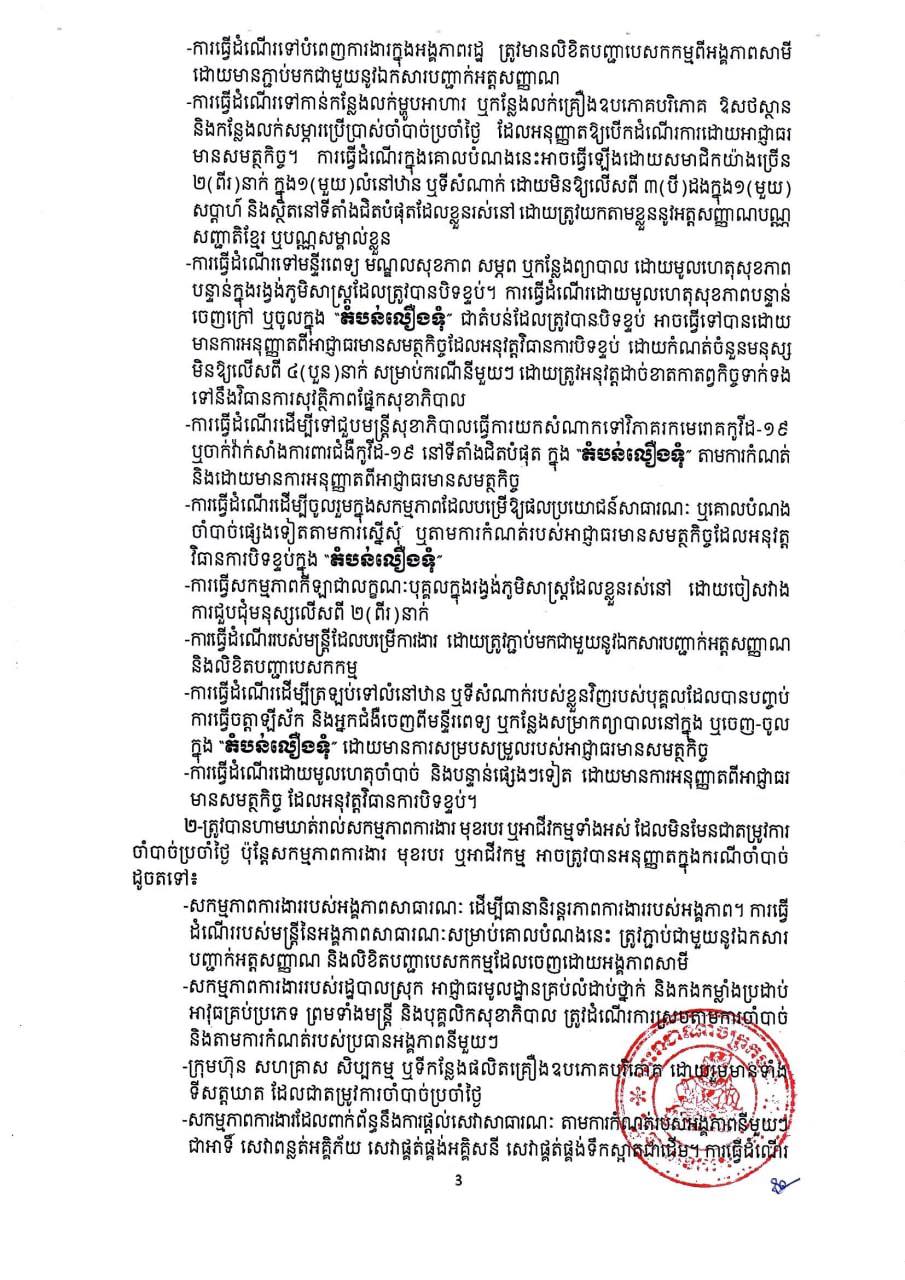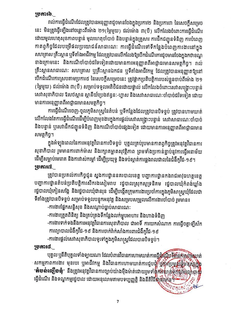 រដ្ឋបាលខេត្តសម្រេចបន្តកំណត់ជា និងបិទខ្ទប់ភូមិសាស្ត្រដែលមានការឆ្លងរាលដាលនៃជំងឺកូវីដ-១៩ ជាបណ្តោះអាសន្ន រយៈពេល ១៤(ដប់បួន)ថ្ងៃ គិតចាប់ពីវេលាម៉ោងសូន្យនាទី នាថ្ងៃទី២៥ ខែសីហា រហូត ដល់ថ្ងៃទី០៧ ខែកញ្ញា ឆ្នាំ២០២១ ដើម្បីទប់ស្កាត់ការឆ្លងរាលដាលនៃជំងឺកូវីដ-១៩ នៅក្នុងភូមិសាស្ត្រឃុំកំពង់ឃ្លាំង ឃុំកៀនសង្កែ ឃុំដានរុន ស្រុកសូទនិគម ខេត្តសៀមរាប ជា”តំបន់លឿងទុំ”៕