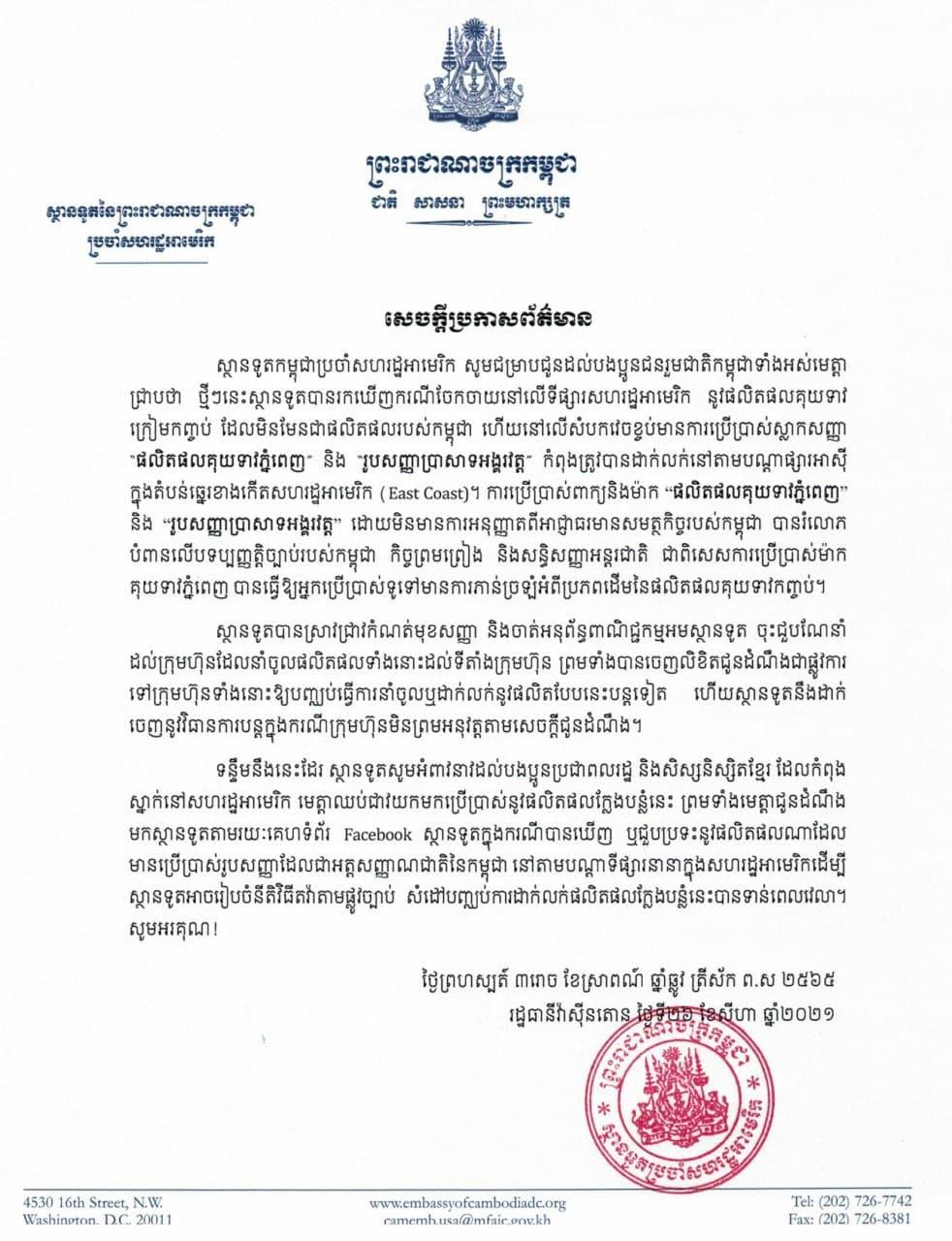 ទន្ទឹមនឹងនេះដែរ ស្ថានទូតសូមអំពាវនាវដល់បងប្អូនប្រជាពលរដ្ឋ និងសិស្សនិស្សិតខ្មែរ ដែលកំពុងស្នាក់នៅសហរដ្ឋអាមេរិក មេត្តាឈប់ជាវយកមកប្រើប្រាស់នូវផលិតផលក្លែងបន្លំនេះ ព្រមទាំងមេត្តាជូនដំណឹងមកស្ថានទូតតាមរយៈគេហទំព័រ Facebook ស្ថានទូតក្នុងករណីបានឃើញ ឬជួបប្រទះនូវផលិតផលណាដែលមានប្រើប្រាស់រូបសញ្ញាដែលជាអត្តសញ្ញាណជាតិនៃកម្ពុជា នៅតាមបណ្តាទីផ្សារនានាក្នុងសហរដ្ឋអាមេរិកដើម្បីស្ថានទូតរៀបចំនីតិវិធីតវ៉ាតាមផ្លូវច្បាប់ សំដៅបញ្ឈប់ការដាក់លក់ផលិតផលក្លែងបន្លំនេះបានទាន់ពេលវេលា៕