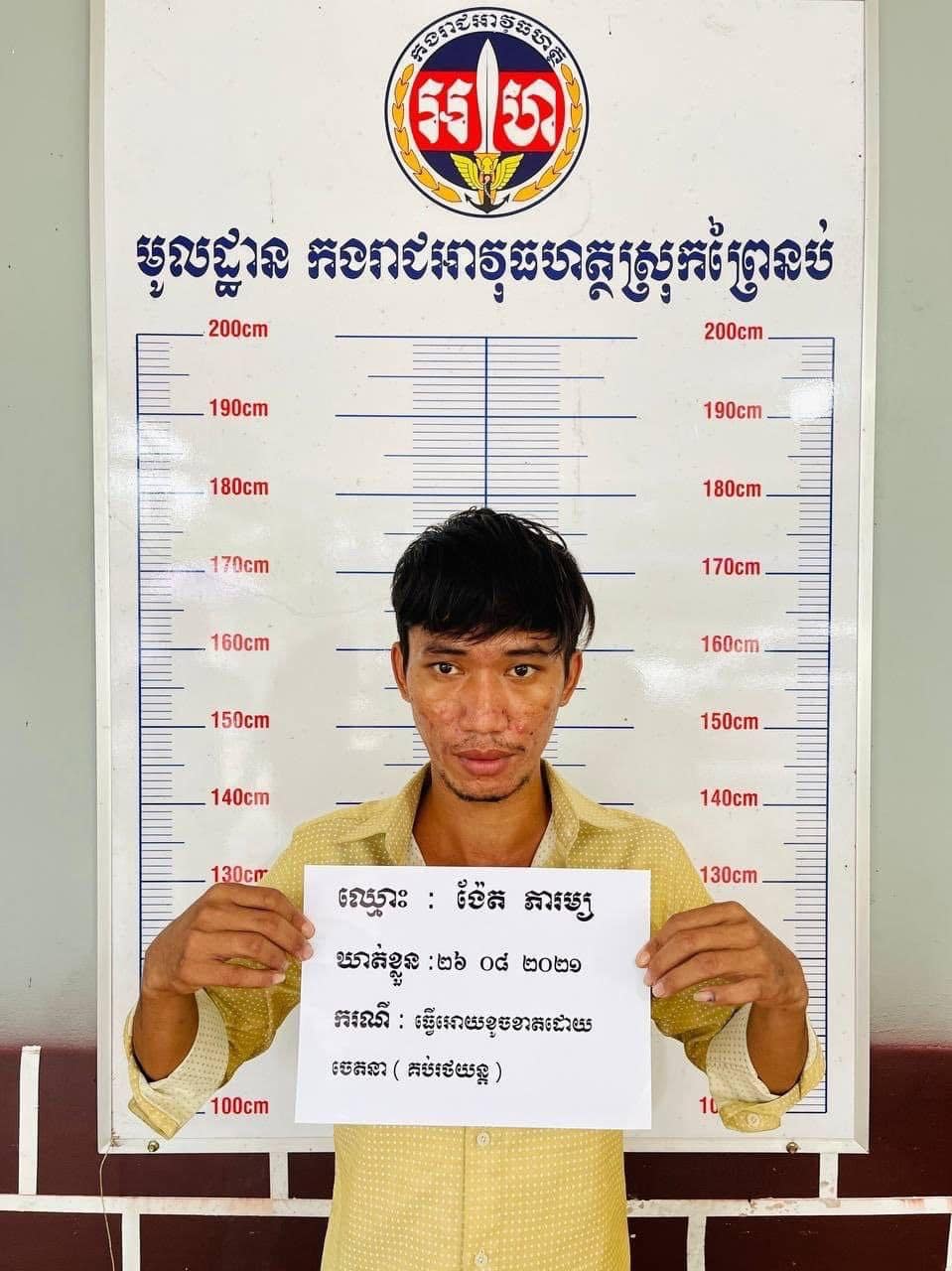 ជនសង្ស័យមានឈ្មោះ ង៉ែត ភារម្យ ភេទប្រុស អាយុ ២៣ឆ្នាំ មុខរបរ ជាងឡាន ទីលំនៅបច្ចុប្បន្នភូមិសំរុងក្រោម ឃុំសំរុង ស្រុកព្រៃនប់ ខេត្តព្រះសីហនុ។ បច្ចុប្បន្នជនសង្ស័យខាងលើ ត្រូវបានកម្លាំងជំនាញបញ្ជូនមកកាន់ការិយាល័យព្រហ្មទណ្ឌ នៃបញ្ជាការដ្ឋានកងរាជអាវុធហត្ថខេត្តព្រះសីហនុ ដើម្បីបន្តនិតីវិធីច្បាប់៕