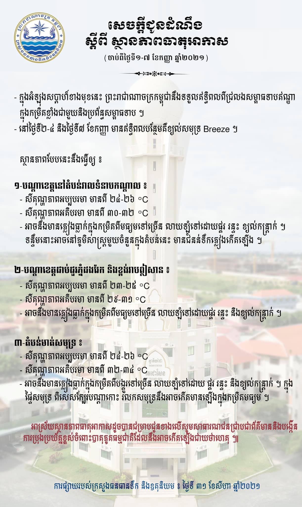 (ភ្នំពេញ)៖ ក្រសួងធនធានទឹក និងឧតុនិយម នៅថ្ងៃទី៣១ ខែសីហា ឆ្នាំ២០២១នេះ បានចេញសេចក្តីប្រកាសព័ត៌មាន បញ្ជាក់ពីស្ថានភាពធាតុអាកាសនៅកម្ពុជា ចាប់ពីថ្ងៃទី១ ដល់ថ្ងៃទី៧ ខែកញ្ញា ឆ្នាំ២០២១ ដោយអំឡុងសប្តាហ៍ខាងមុខនេះ ព្រះរាជាណាចក្រកម្ពុជានឹងទទួលឥទ្ធិពលពីជ្រលងសម្ពាធទាបឥណ្ឌាក្នុងកម្រិតខ្លាំងជាមួយនឹងប្រព័ន្ធសម្ពាធទាប។ ហើយនៅថ្ងៃទី២-៤ ខែកញ្ញា មានឥទ្ធិពលបន្ថែមគឺខ្យល់សមុទ្រ Breeze។ ស្ថានភាពបែបនេះនឹងធ្វើឲ្យ៖