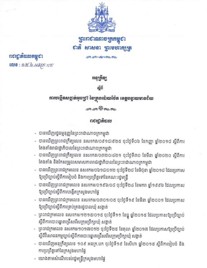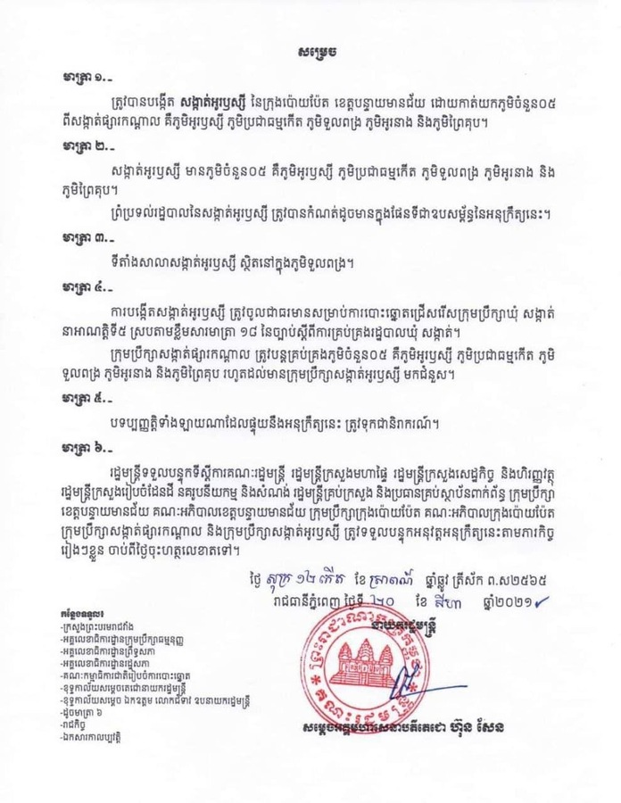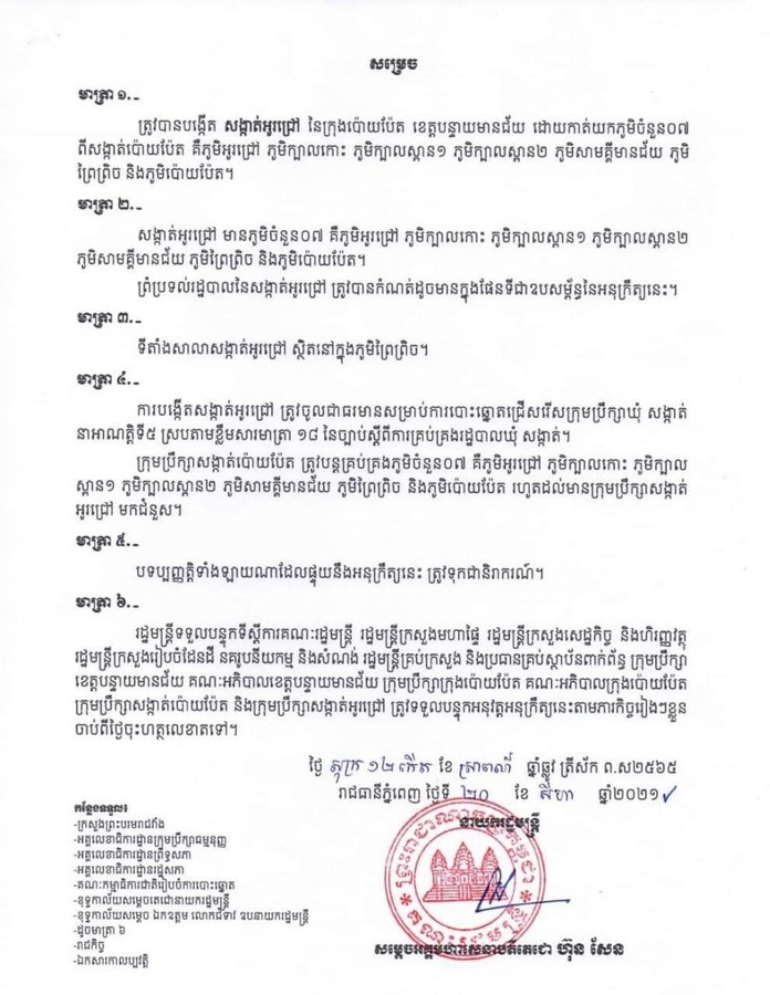 រាជរដ្ឋាភិបាល ចេញអនុក្រឹត្យស្តីពី ការបង្កើតសង្កាត់ចំនួន០២បន្ថែមទៀត ក្នុងក្រុងប៉ោយប៉ែត នៃខេត្តបន្ទាយមានជ័យ