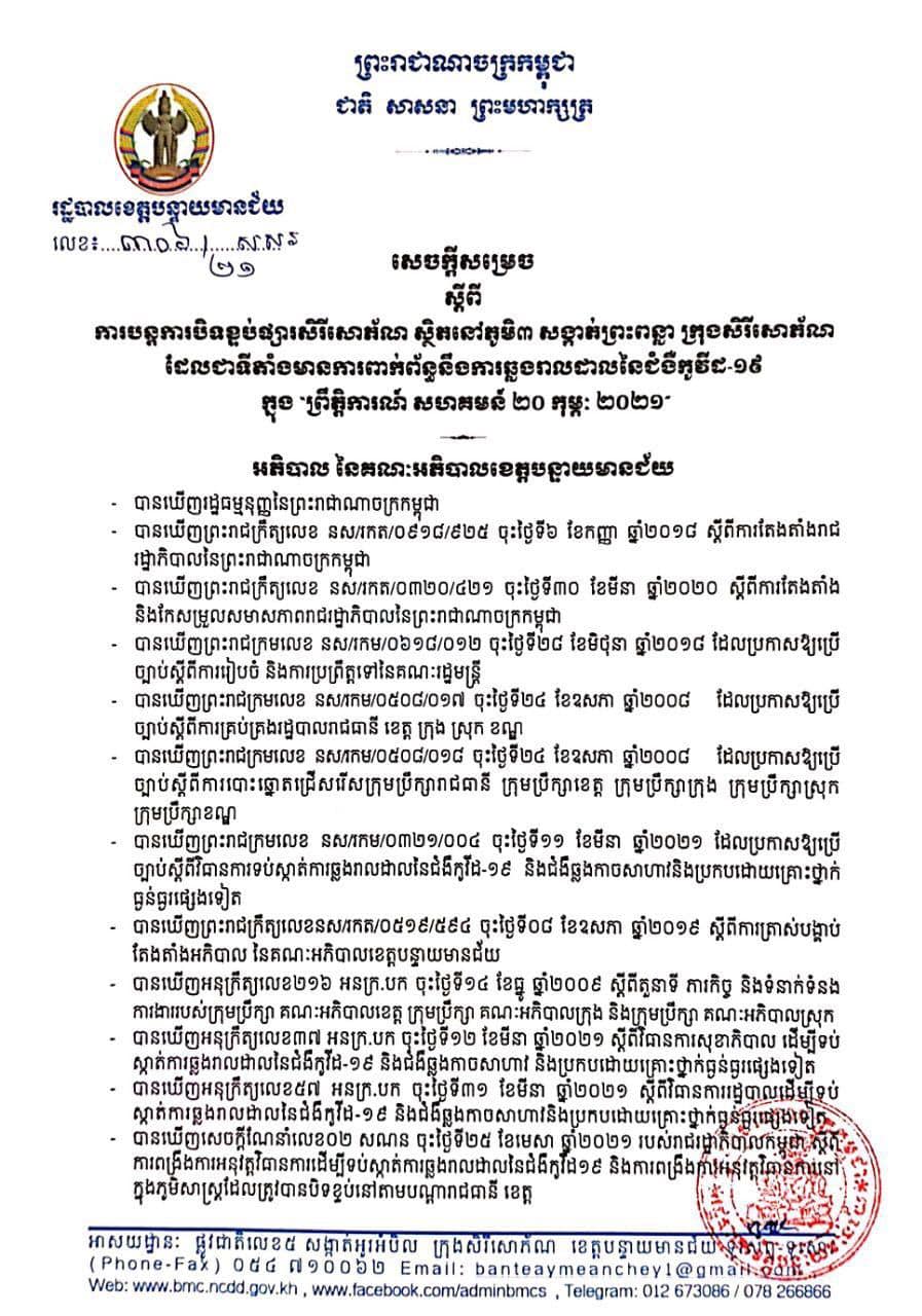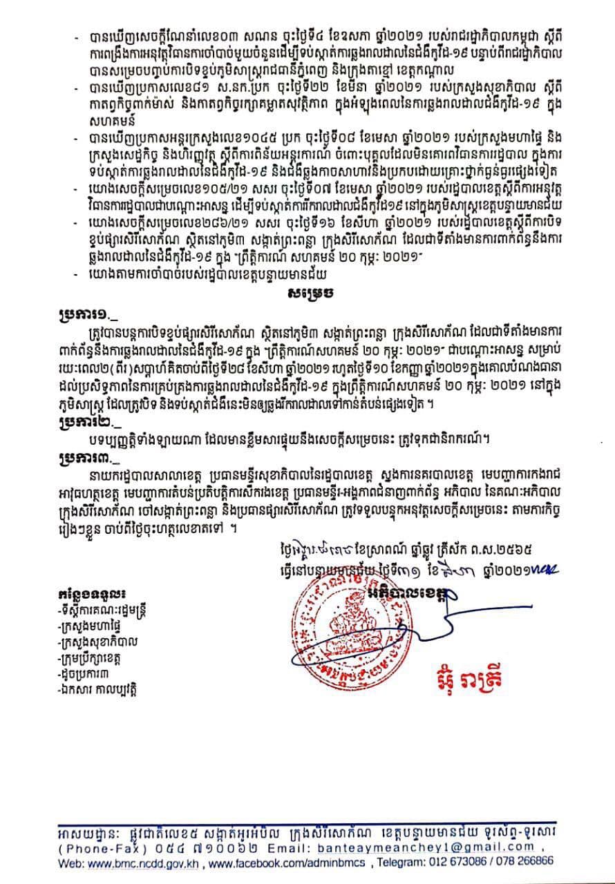 រដ្ឋបាលខេត្តបន្ទាយមានជ័យ បានសម្រេច បន្តការបិទខ្ទប់ផ្សារសិរីសោភ័ណ ស្ថិតនៅភូមិ៣ សង្កាត់ព្រះពន្លា ក្រុងសិរីសោភ័ណ ដែលជាទីតាំងមានការពាក់ព័ន្ធនឹងការឆ្លងរាលដាលនៃជំងឺកូវីដ-១៩ ក្នុង “ព្រឹត្តិការណ៍សហគមន៍ ២០ កុម្ភៈ ២០២១ ជាបណ្តោះអាសន្ន សម្រាប់រយៈពេល២(ពីរ)សប្តាហ៍គិតចាប់ពីថ្ងៃទី២៨ ខែសីហា ឆ្នាំ២០២១ រហូតថ្ងៃទី១០ ខែកញ្ញា ឆ្នាំ២០២១ ក្នុងគោលបំណងធានាដល់ប្រសិទ្ធភាពនៃការគ្រប់គ្រងការឆ្លងរាលដាលនៃជំងឺកូវីដ-១៩ ក្នុងព្រឹត្តិការណ៍សហគមន៍ ២០ កុម្ភៈ ២០២១ នៅក្នុងភូមិសាស្ត្រ ដែលត្រូវបិទ និងទប់ស្កាត់ជំងឺនេះមិនឲ្យឆ្លងរីករាលដាលទៅកាន់តំបន់ផ្សេងទៀត ៕