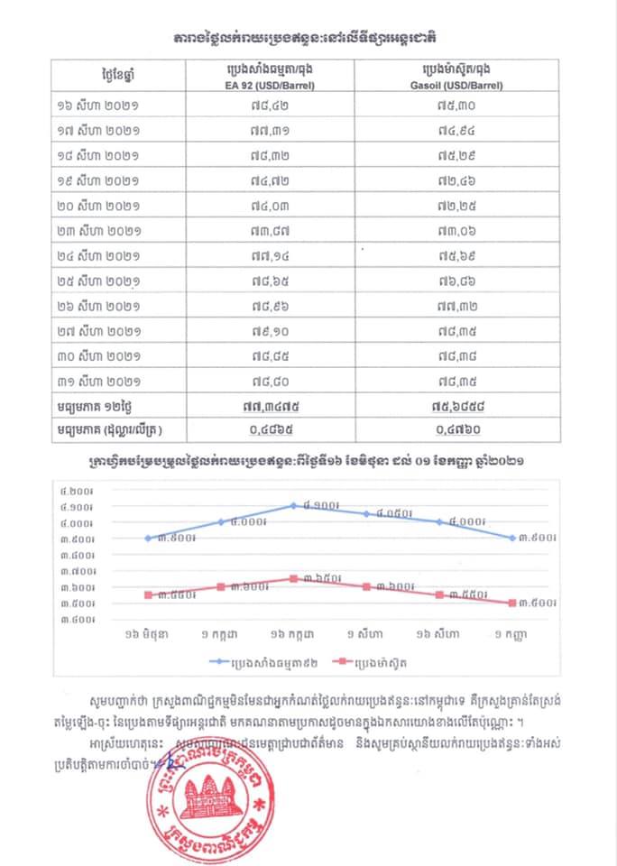 រាជធានីភ្នំពេញ៖ យោងតាមលិខិតរបស់ក្រសួងពាណិជ្ជកម្ម ចុះផ្សាយថ្ងៃទី០១ ខែកញ្ញា ឆ្នាំ២០២១ ស្តីអំពីតម្លៃលក់រាយប្រេងឥន្ធនៈនៅតាមស្ថានីយទាំងអស់ក្នុងព្រះរាជាណាចក្រកម្ពុជាសម្រាប់អនុវត្តទៅតាមតម្លៃមធ្យមប្រេងឥន្ធនៈលើទីផ្សារអន្តរជាតិ ចាប់ពីថ្ងៃទី០១ ដល់ថ្ងៃទី១៥ ខែកញ្ញា ឆ្នាំ២០២១ បានឲ្យដឹងថា តម្លៃប្រេងសាំងធម្មតាមានតម្លៃ ៣,៩០០រៀលក្នុងមួយលីត្រ ចំណែកឯប្រេងសាំងម៉ាស៊ូតមានតម្លៃ ៣,៥០០រៀលក្នុងមួយលីត្រប៉ុណ្ណោះ។