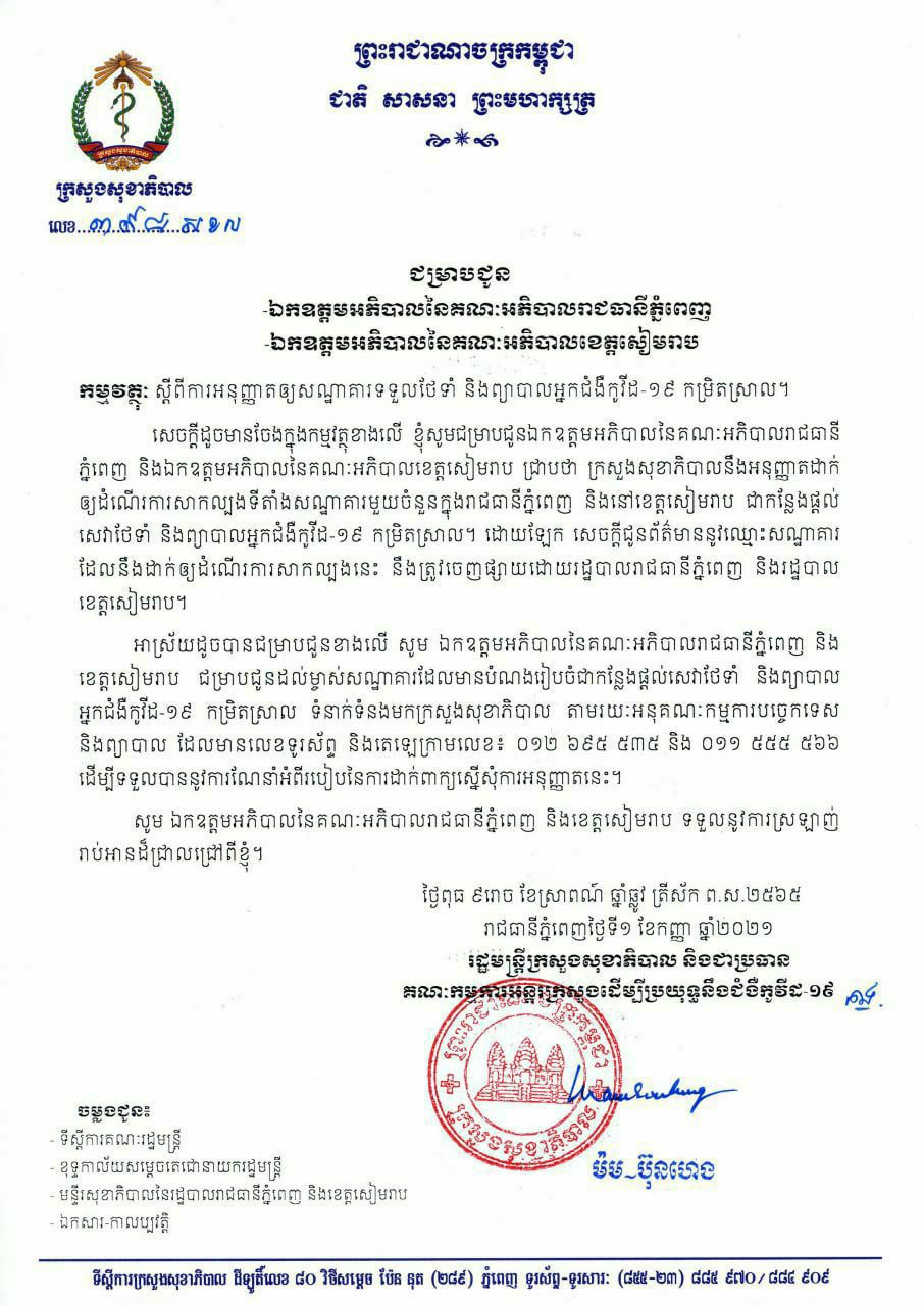 យោងតាមការបញ្ជាក់ពី ក្រសួងសុខាភិបាល បានឲ្យដឹងថា ក្រសួងនឹងអនុញ្ញាតដាក់ឲ្យដំណើរការសាកល្បងទីតាំងសណ្ឋាគារមួយចំនួននៅក្នុងរាជធានីភ្នំពេញ និងនៅខេត្តសៀមរាប ជាកន្លែងផ្តល់សេវាថែទាំ និងព្យបាលអ្នកជំងឺកូវីដ-១៩ កម្រិតស្រាល។ ដោយឡែក សេចក្តីជូនព័ត៌មាននូវឈ្មោះសណ្ឋាគារដែលនឹងដាក់ឲ្យដំណើរការសាកល្បងនេះ នឹងត្រូវចេញផ្សាយដោយរដ្ឋបាលរាជធានីភ្នំពេញ និងរដ្ឋបាលខេត្តសៀមរាប។