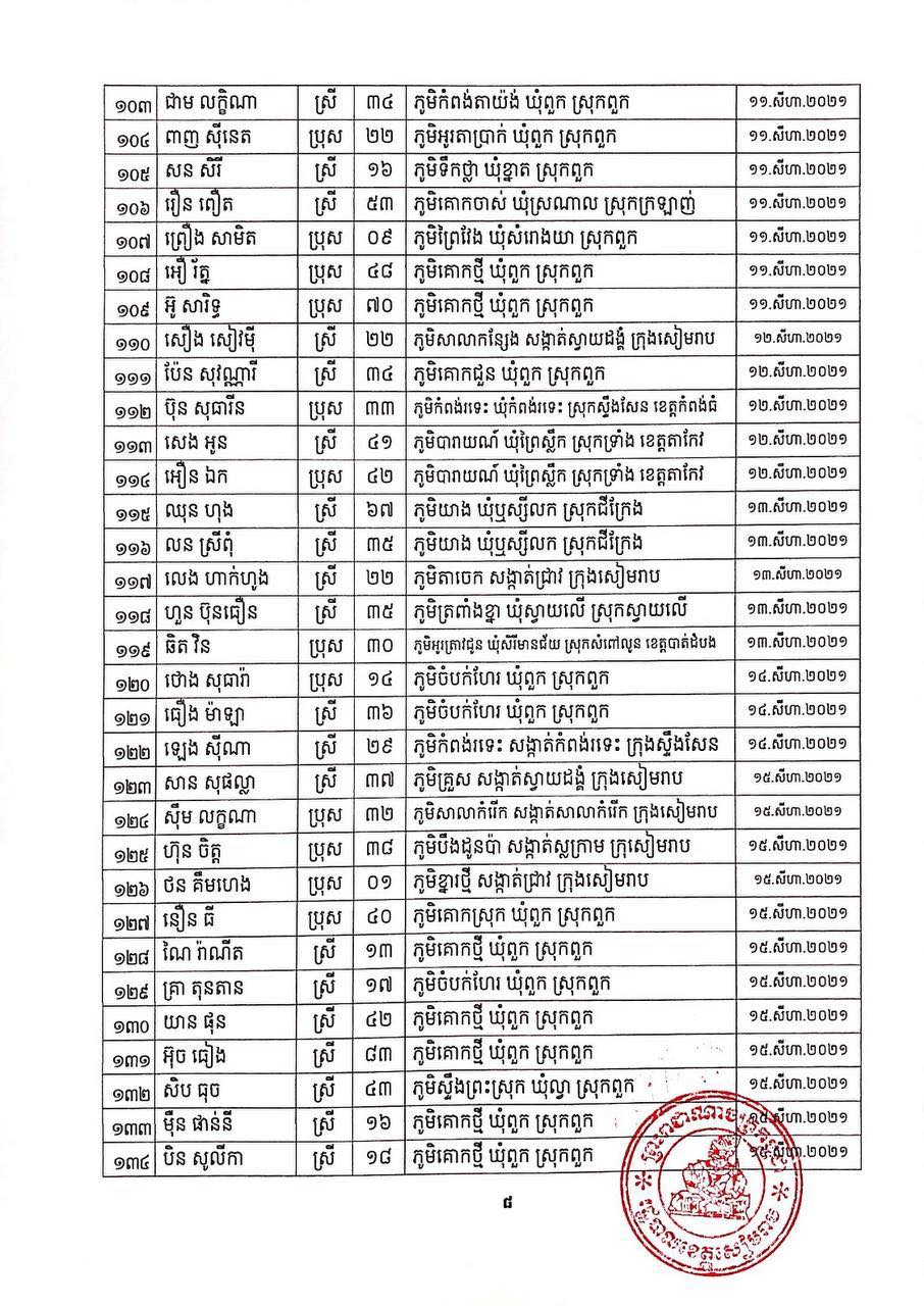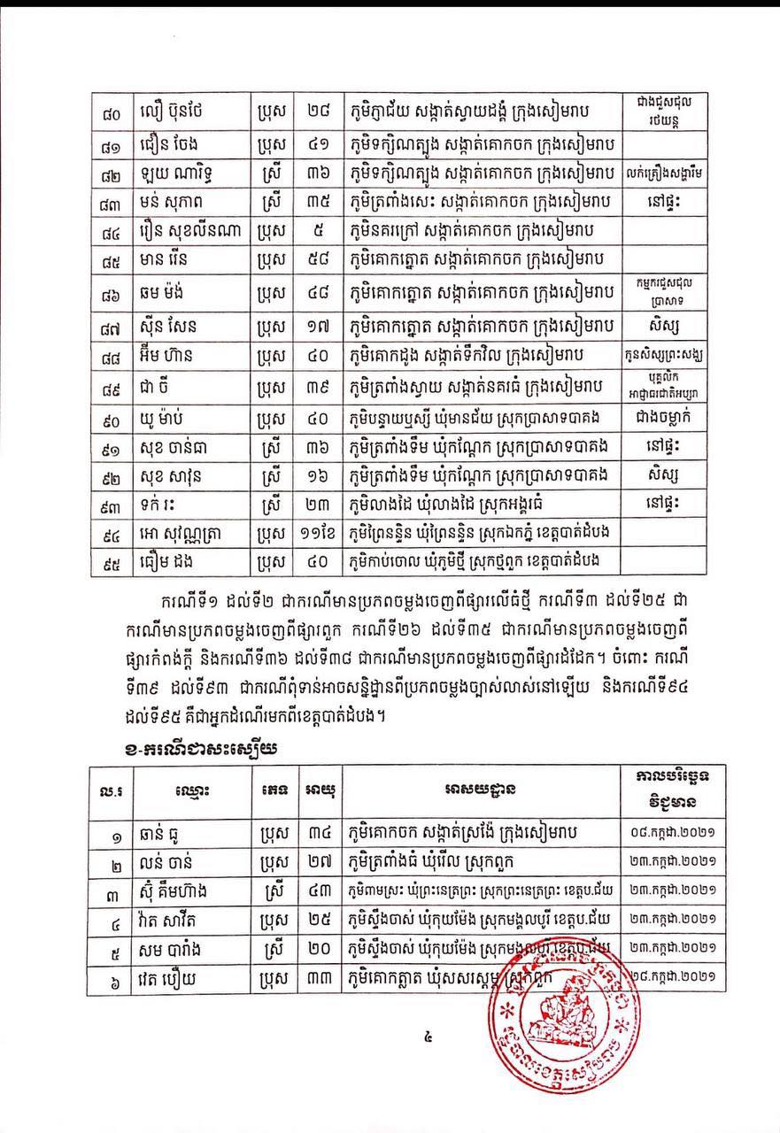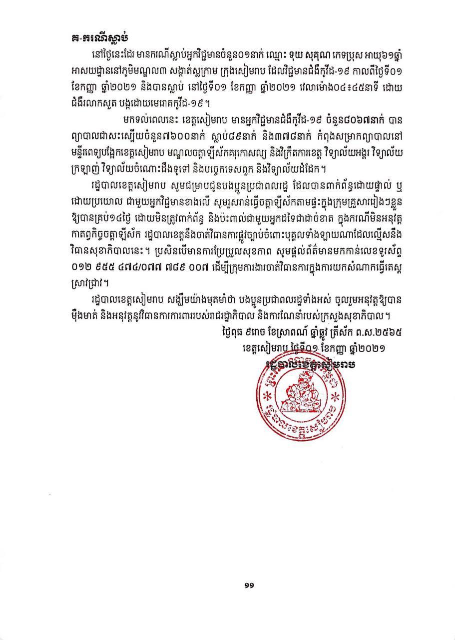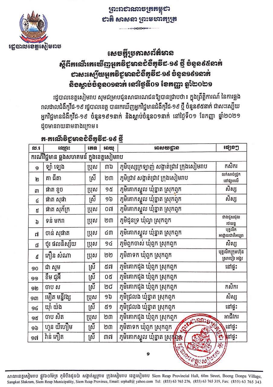 ខេត្តសៀមរាប៖ យោងតាមសេចក្ដីប្រកាសព័ត៌មានពី រដ្ឋបាលខេត្តសៀមរាប សូមជម្រាបជូនសាធារណជនឱ្យបានជ្រាបថា ក្នុងព្រឹត្តិការណ៍ នៃការឆ្លងរាលដាលជំងឺកូវីដ-១៩ រដ្ឋបាលខេត្ត បានរកឃើញអ្នកវិជ្ជមានជំងឺកូវីដ-១៩ថ្មី ចំនួន ៩៥នាក់ ជាសះស្បើយ អ្នកវិជ្ជមានជំងឺកូវីដ-១៩ ចំនួន ១៩១នាក់ និងស្លាប់ចំនួន ០១នាក់ នៅថ្ងៃទី០១ ខែកញ្ញា ឆ្នាំ២០២១ ដូចមានរាយនាមខាងក្រោម៖