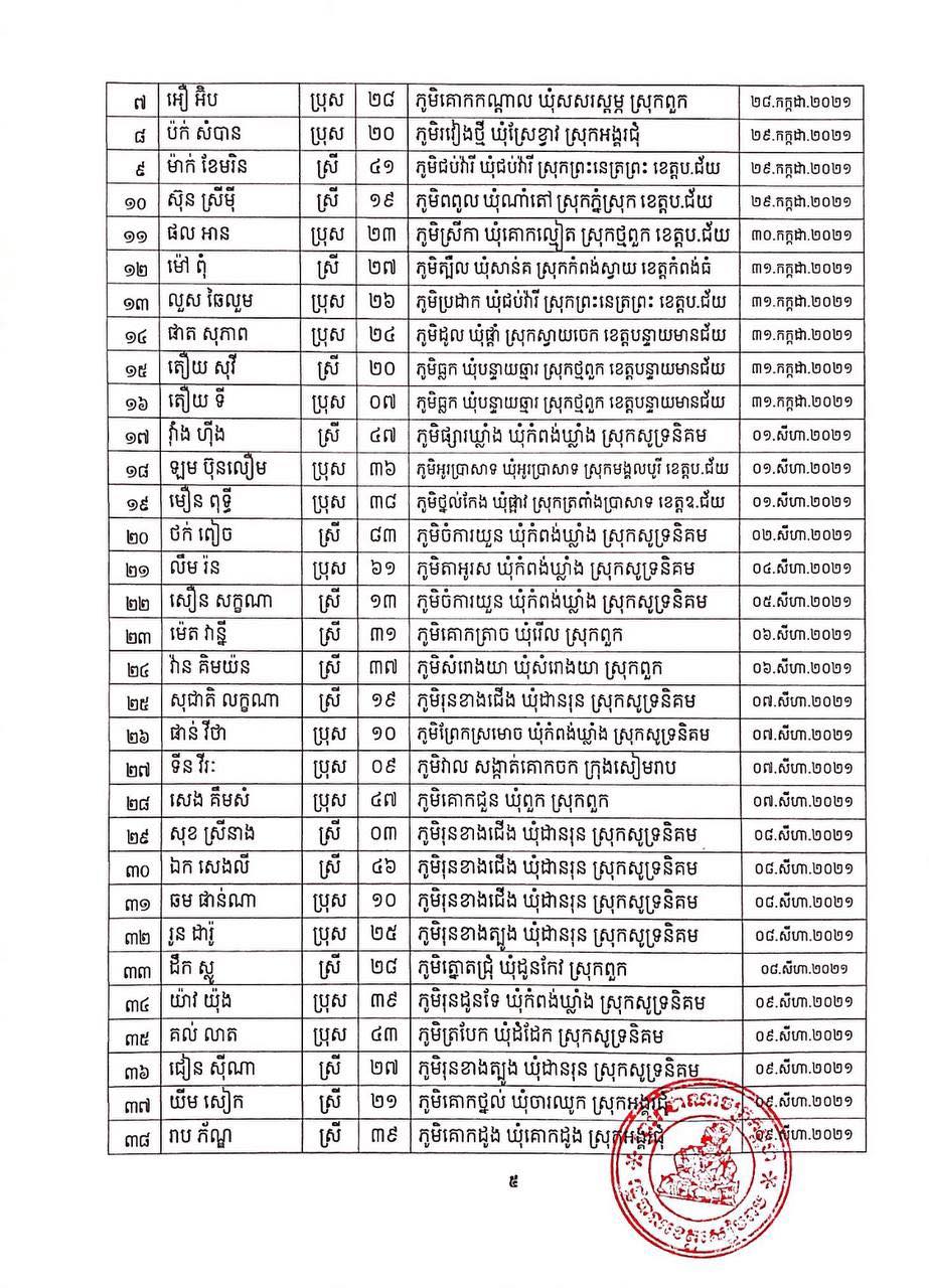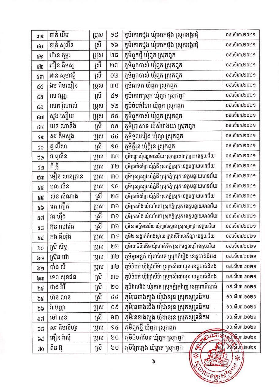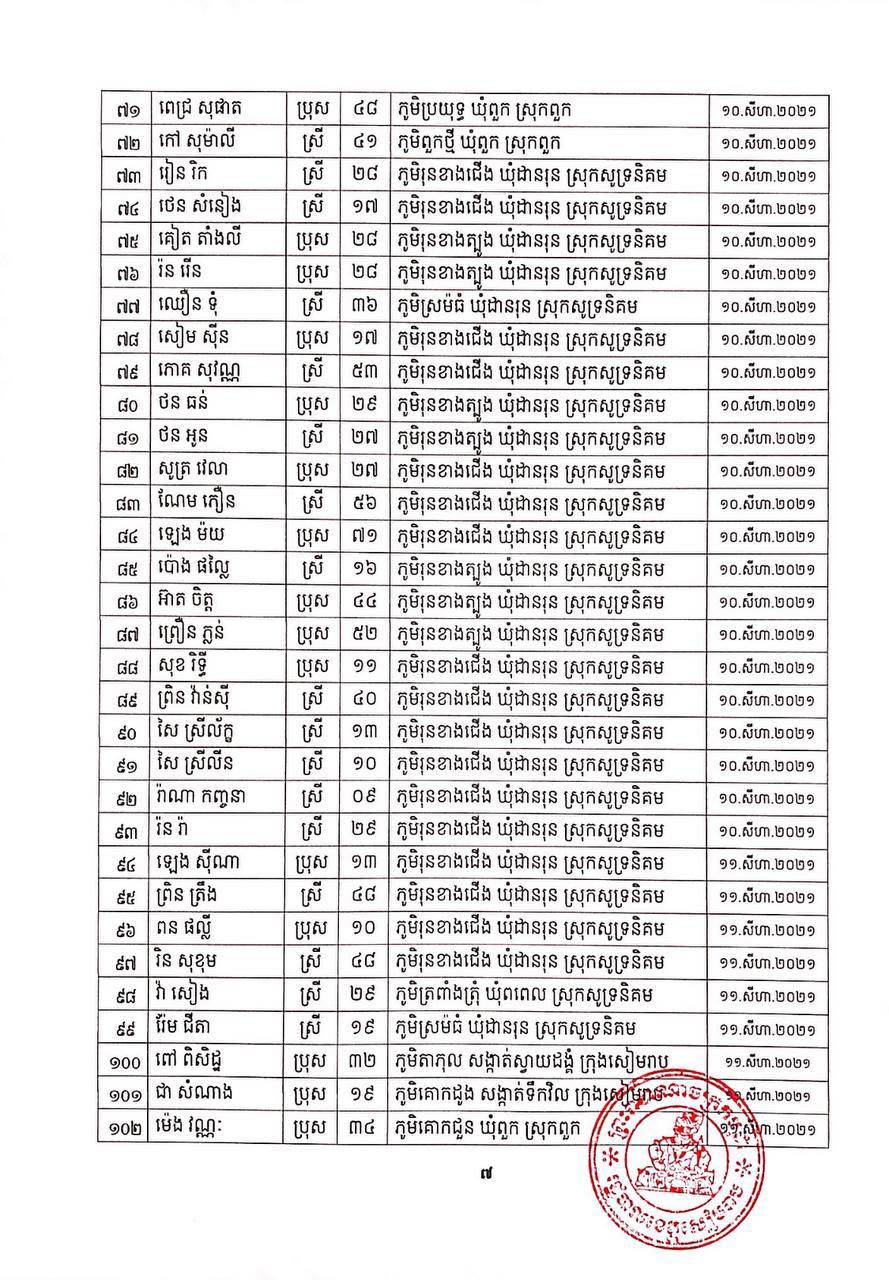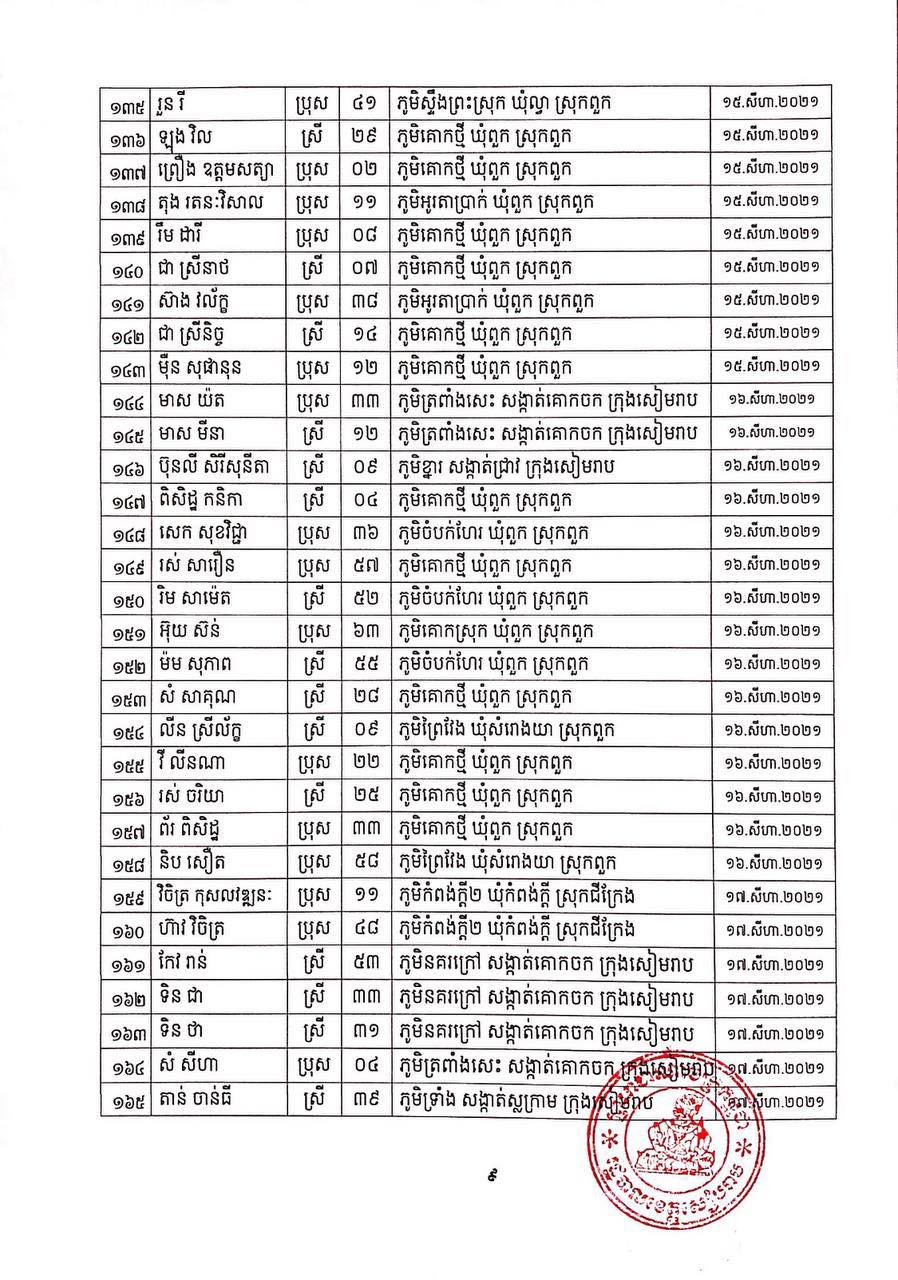 ខេត្តសៀមរាប៖ យោងតាមសេចក្ដីប្រកាសព័ត៌មានពី រដ្ឋបាលខេត្តសៀមរាប សូមជម្រាបជូនសាធារណជនឱ្យបានជ្រាបថា ក្នុងព្រឹត្តិការណ៍ នៃការឆ្លងរាលដាលជំងឺកូវីដ-១៩ រដ្ឋបាលខេត្ត បានរកឃើញអ្នកវិជ្ជមានជំងឺកូវីដ-១៩ថ្មី ចំនួន ៩៥នាក់ ជាសះស្បើយ អ្នកវិជ្ជមានជំងឺកូវីដ-១៩ ចំនួន ១៩១នាក់ និងស្លាប់ចំនួន ០១នាក់ នៅថ្ងៃទី០១ ខែកញ្ញា ឆ្នាំ២០២១ ដូចមានរាយនាមខាងក្រោម៖