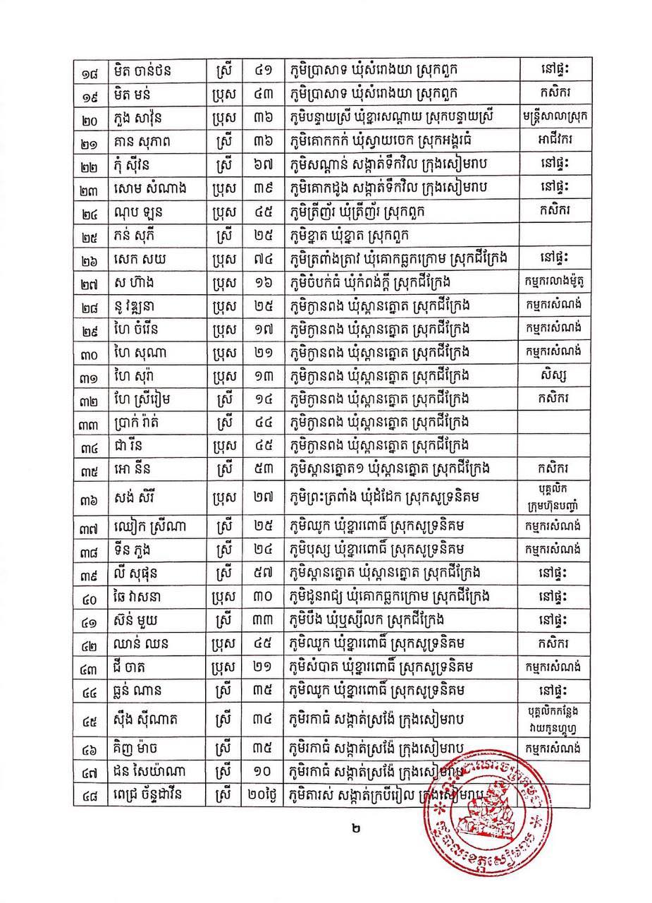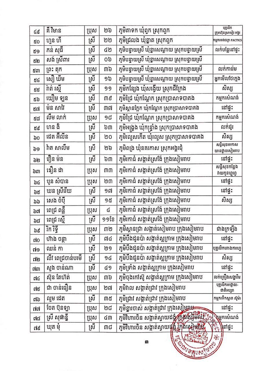 ខេត្តសៀមរាប បន្តរកឃើញអ្នកវិជ្ជមានកូវីដ-១៩ថ្មី ចំនួន ៩៥នាក់ និងជាសះស្បើយ ១៩១នាក់ នៅថ្ងៃទី០១ ខែកញ្ញា