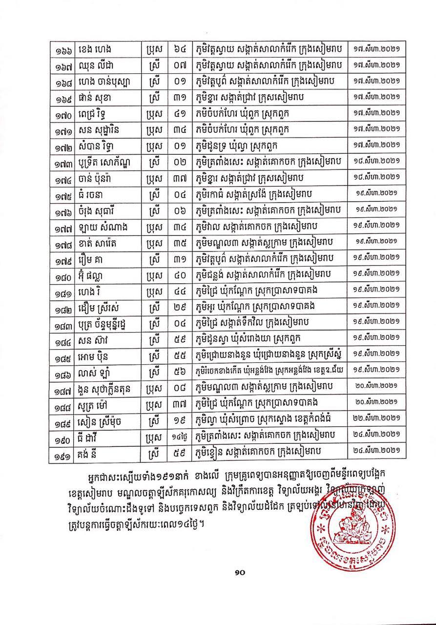 អ្នកជាសះស្បើយទាំង១៩១នាក់ ខាងលើ ក្រុមគ្រូពេទ្យបានអនុញ្ញាតឱ្យចេញពីមន្ទីរពេទ្យបង្អែក ខេត្តសៀមរាប មណ្ឌលចត្តាឡីស័កគរុកោសល្យ និងវិក្រឹតការខេត្ត វិទ្យាល័យអង្គរ វិទ្យាល័យក្រឡាញ់ វិទ្យាល័យចំណោះដឹងទូទៅ និងបច្ចេកទេសពួក និងវិទ្យាល័យដំដែក ត្រឡប់ទៅលំនៅឋានវិញ ដោយត្រូវបន្តការធ្វើចត្តាឡីស័ករយៈពេល១៤ថ្ងៃ។