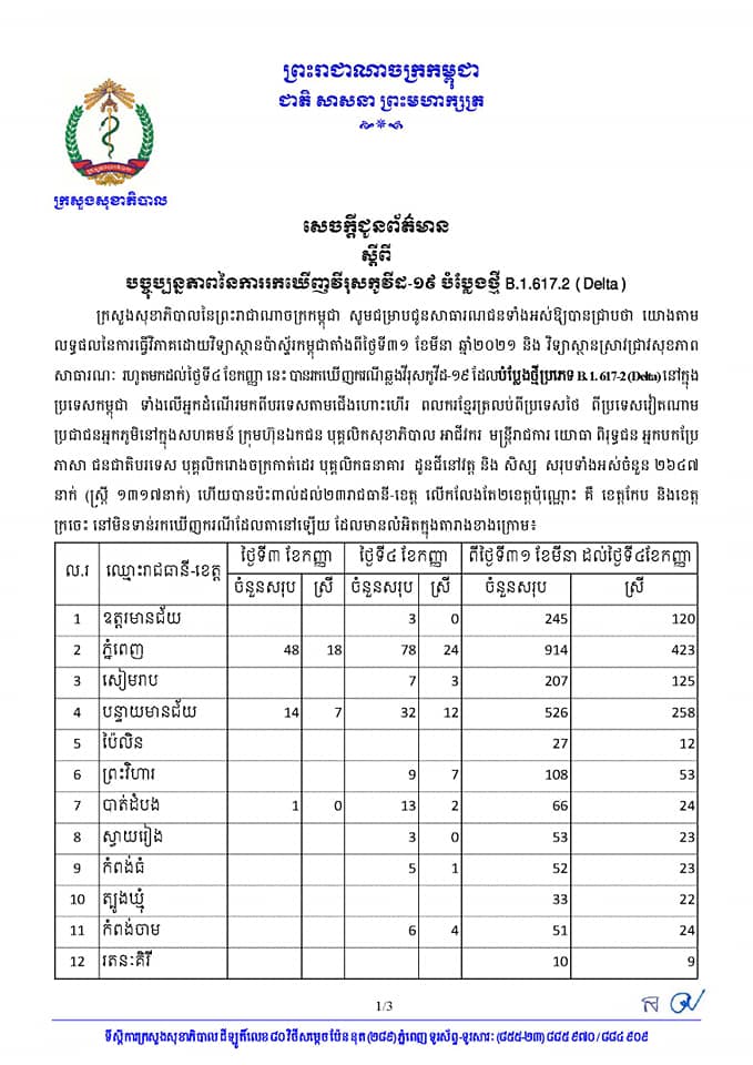 យោងតាមការបញ្ជាក់ពី ក្រសួងសុខាភិបាល នៅល្ងាចថ្ងៃទី៥ ខែកញ្ញា បានឲ្យដឹងថា យោងតាមលទ្ធផលនៃការធ្វើវិភាគដោយវិទ្យាស្ថានប៉ាស្ទ័រកម្ពុជា តាំងពីថ្ងៃទី៣១ ខែមីនា ឆ្នាំ២០២១ និងវិទ្យាស្ថានស្រាវជ្រាវសុខភាពសាធារណៈ រហូតមកដល់ថ្ងៃទី៤ ខែកញ្ញានេះ បានរកឃើញករណីឆ្លងវីរុសកូវីដ១៩ ដែលបំប្លែងថ្មី ប្រភេទ B.1.617.2 (Delta) នៅក្នុងប្រទេសកម្ពុជា