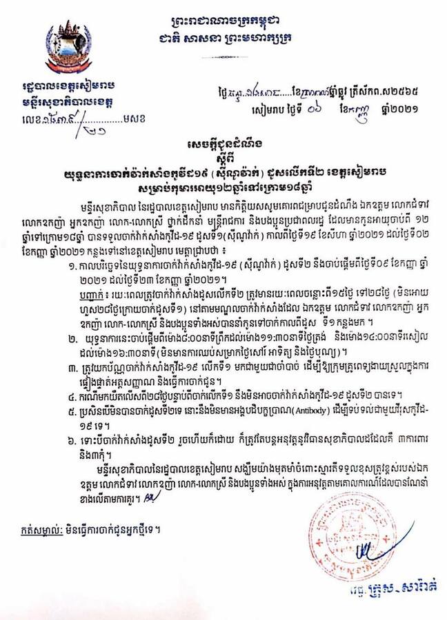 រដ្ឋបាលខេត្តសៀមរាប ចេញសេចក្តីជូនដំណឹង ស្តីពីយុទ្ធនាការចាក់វ៉ាក់សាំងកូវីដ-១៩ (ស៊ីណូវ៉ាក់) ដូសលើកទី២ សម្រាប់កុមារអាយុ១២ឆ្នាំទៅក្រោម១៨ឆ្នាំ