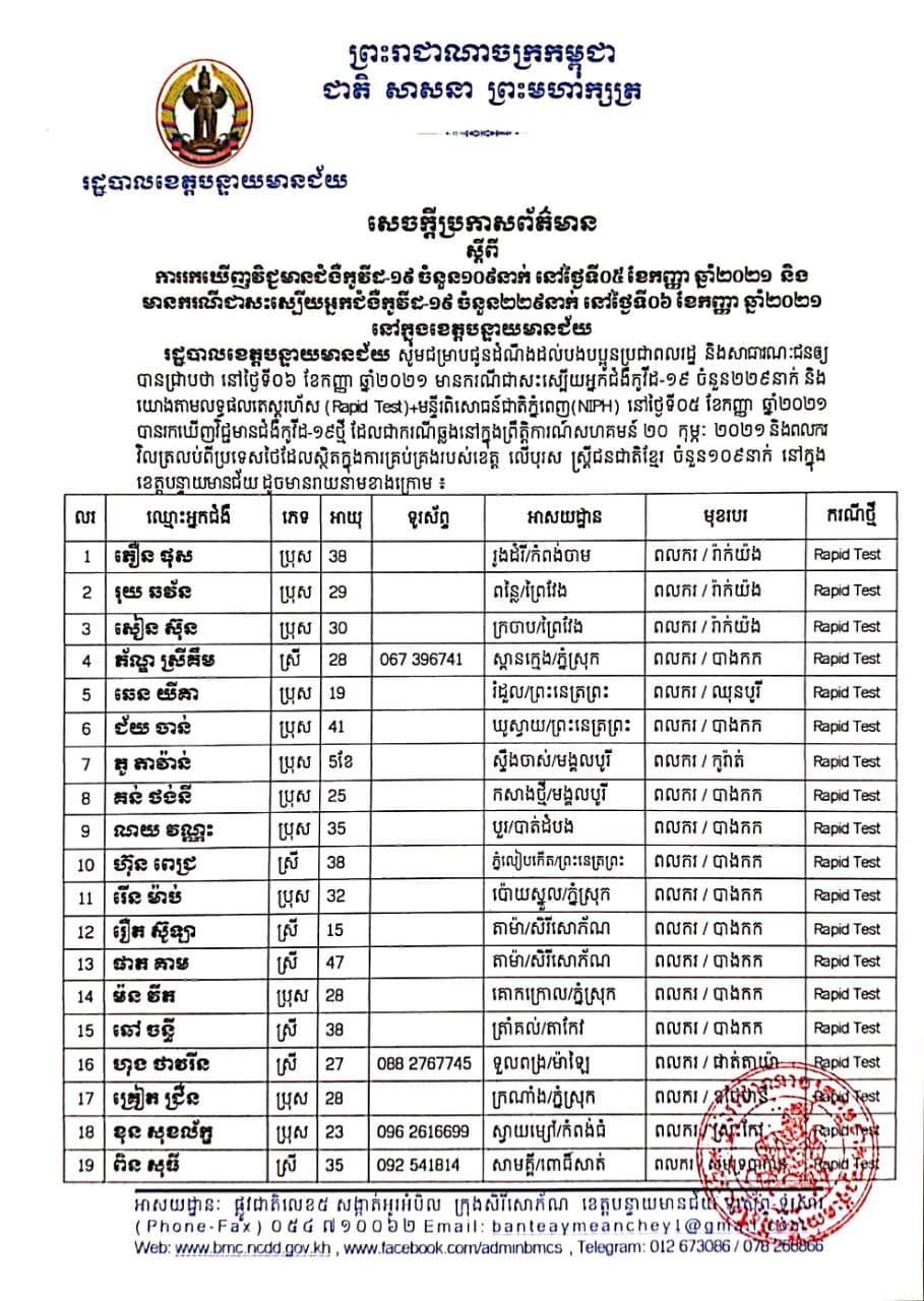 ខេត្តបន្ទាយមានជ័យ៖ យោងតាមសេចក្តីប្រកាសព័ត៌មានរបស់ រដ្ឋបាលខេត្តបន្ទាយមានជ័យ បានបន្តរកឃេីញអ្នកវិជ្ជមានជំងឺកូវីដ-១៩ ចំនួន ១០៩នាក់ និងអ្នកជាសះស្បេីយចំនួន ២២៩នាក់ នៅថ្ងៃទី០៦ ខែកញ្ញា ឆ្នាំ២០២១ ដោយយោងតាមលទ្ធផលតេស្តរហ័ស(Rapid Test) មន្ទីរពិសោធន៍ជាតិភ្នំពេញ(NIPH) នៅថ្ងៃទី០៥ ខែកញ្ញា ឆ្នាំ២០២១ រកឃើញវិជ្ជមានជំងឺកូវីដ-១៩ ដែលជាករណីឆ្លងនៅក្នុងព្រឹត្តិការណ៍សហគមន៍ ២០ កុម្ភៈ ២០២១ និងពលករវិលត្រលប់ពីប្រទេសថៃ ដែលស្ថិតក្នុងការគ្រប់គ្រងរបស់ខេត្ត លើបុរស ស្ត្រីជនជាតិខ្មែរ ចំនួន ១០៩នាក់ នៅក្នុងខេត្តបន្ទាយមានជ័យ ដូចមានរាយនាមខាងក្រោម៖