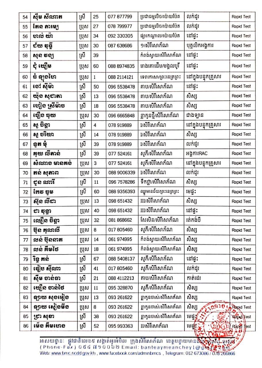 ខេត្តបន្ទាយមានជ័យ បន្តរកឃើញអ្នកវិជ្ជមានជំងឺកូវីដ-១៩ថ្មី ចំនួន ១០៩នាក់បន្ថែមទៀត