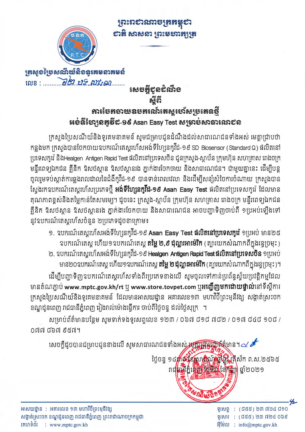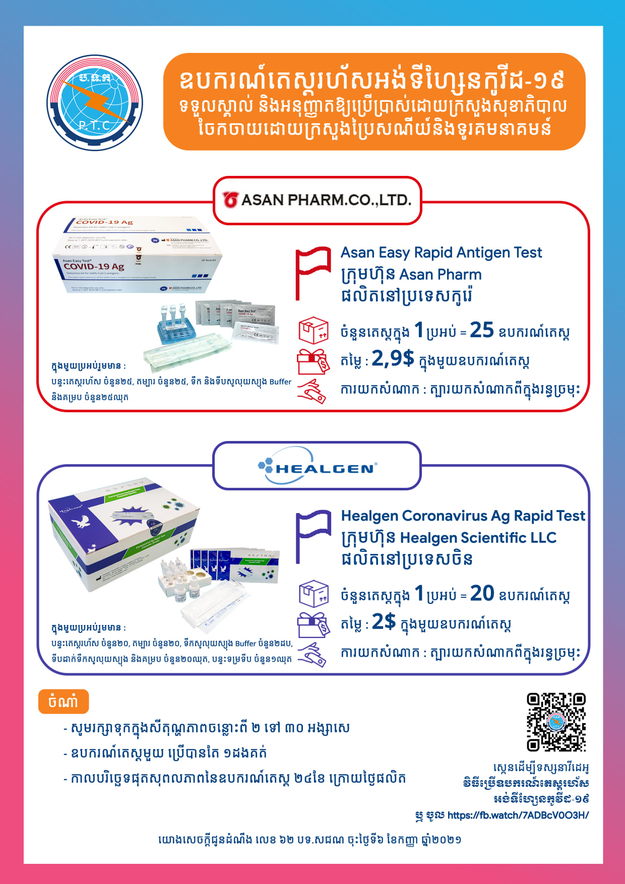 រាជធានីភ្នំពេញ៖ យោងតាមការចុះផ្សាយរបស់ ក្រសួងប្រៃសណីយ៍ និងទូរគមនាគមន៍ សូមជម្រាបជូនដំណឹងដល់សាធារណជនទាំងអស់មេត្តាជ្រាបថា កន្លងមក ក្រសួងបានចែកចាយឧបករណ៍តេស្តរហ័សអង់ទីហ្សែនកូវីដ-១៩ SD Biosensor (Standard Q) ផលិតនៅប្រទេសកូរ៉េ និងHealgen Antigen Rapid Test ផលិតនៅប្រទេសចិន ជូនក្រសួង-ស្ថាប័ន ក្រុមហ៊ុន សហគ្រាស រោងចក្រ មន្ទីរពេទ្យឯកជន គ្លីនិក ឱសថស្ថាន ឱសថស្ថានរង ភ្នាក់ងារចែកចាយ និងសាធារណជន។