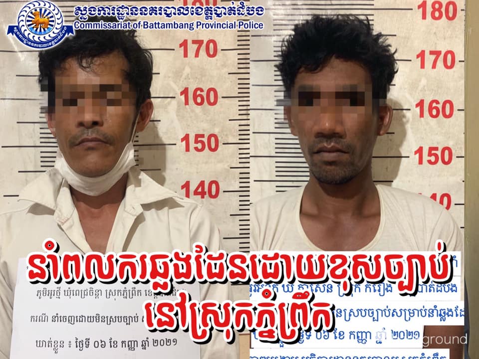 ខេត្តបាត់ដំបង៖ យោងតាមការចុះផ្សាយពី ស្នងការដ្ឋាននគរបាលខេត្តបាត់ដំបង នៅថ្ងៃទី០៧ ខែកញ្ញា ឆ្នាំ២០២១ បានឲ្យដឹងថា កាលពីថ្ងៃទី០៥ ខែកញ្ញា ឆ្នាំ២០២១ វេលាម៉ោងប្រមាណ ២៣និង៤០នាទី នៅចំណុចច្រកទ្វាព្រំដែនអូររំដូល ស្ថិតក្នុងភូមិ អូរថ្មី ឃុំពេជ្រចិន្តា ស្រុកភ្នំព្រឹក ខេត្តបាត់ដំបង មានករណីនាំឆ្លងដែនដោយមិនស្របច្បាប់មួយបានកើតឡើង ដែលករណីនេះមានជនសង័្សយជាមេខ្យល់ចំនួន ០២នាក់ បានលបលួចនាំពលរដ្ឋចំនួន ១១នាក់ រួមទាំងកុមារផងប៉ុនប៉ងជ្រៀតចូលទៅក្នុងប្រទេសថៃ។