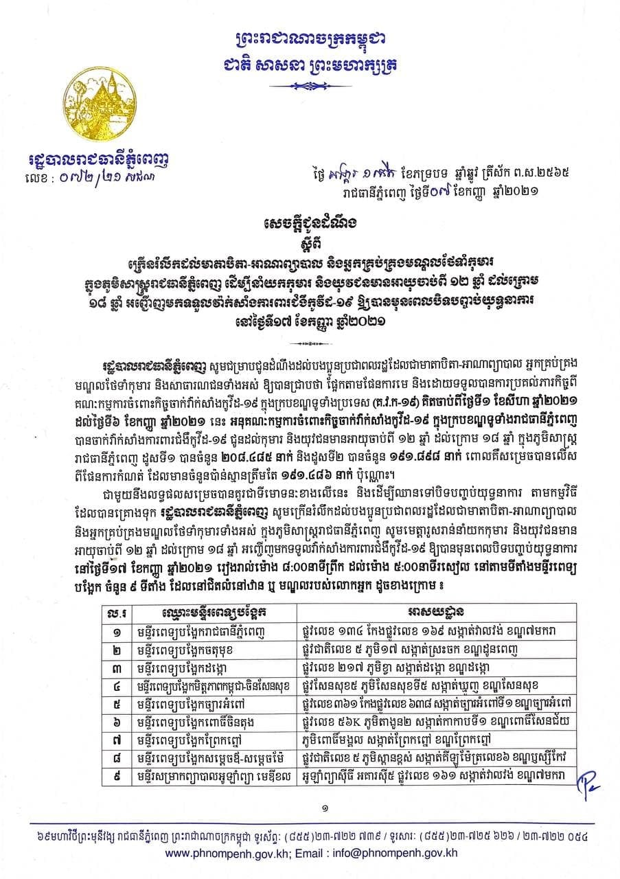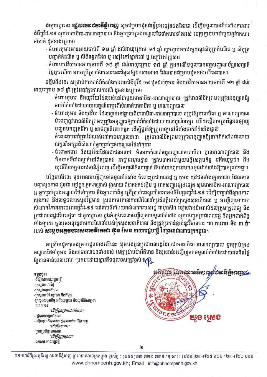 រដ្ឋបាលរាជធានីភ្នំពេញ បានចេញសេចក្ដីជូនដំណឹង ស្ដីពីការក្រើនរំលឹកដល់មាតាបិតា-អាណាព្យាបាល និងអ្នកគ្រប់គ្រងមណ្ឌលថែទាំកុមារ ក្នុងភូមិសាស្ត្ររាជធានីភ្នំពេញ ដើម្បីនាំយកកុមារ និងយុវជនមានអាយុចាប់ពី ១២ឆ្នាំ ដល់ក្រោម ១៨ឆ្នាំ អញ្ជើញមកទទួលវ៉ាក់សាំងការពារជំងឺកូវីដ-១៩ ឱ្យបានមុនពេលបិទបញ្ចប់យុទ្ធនាការ។