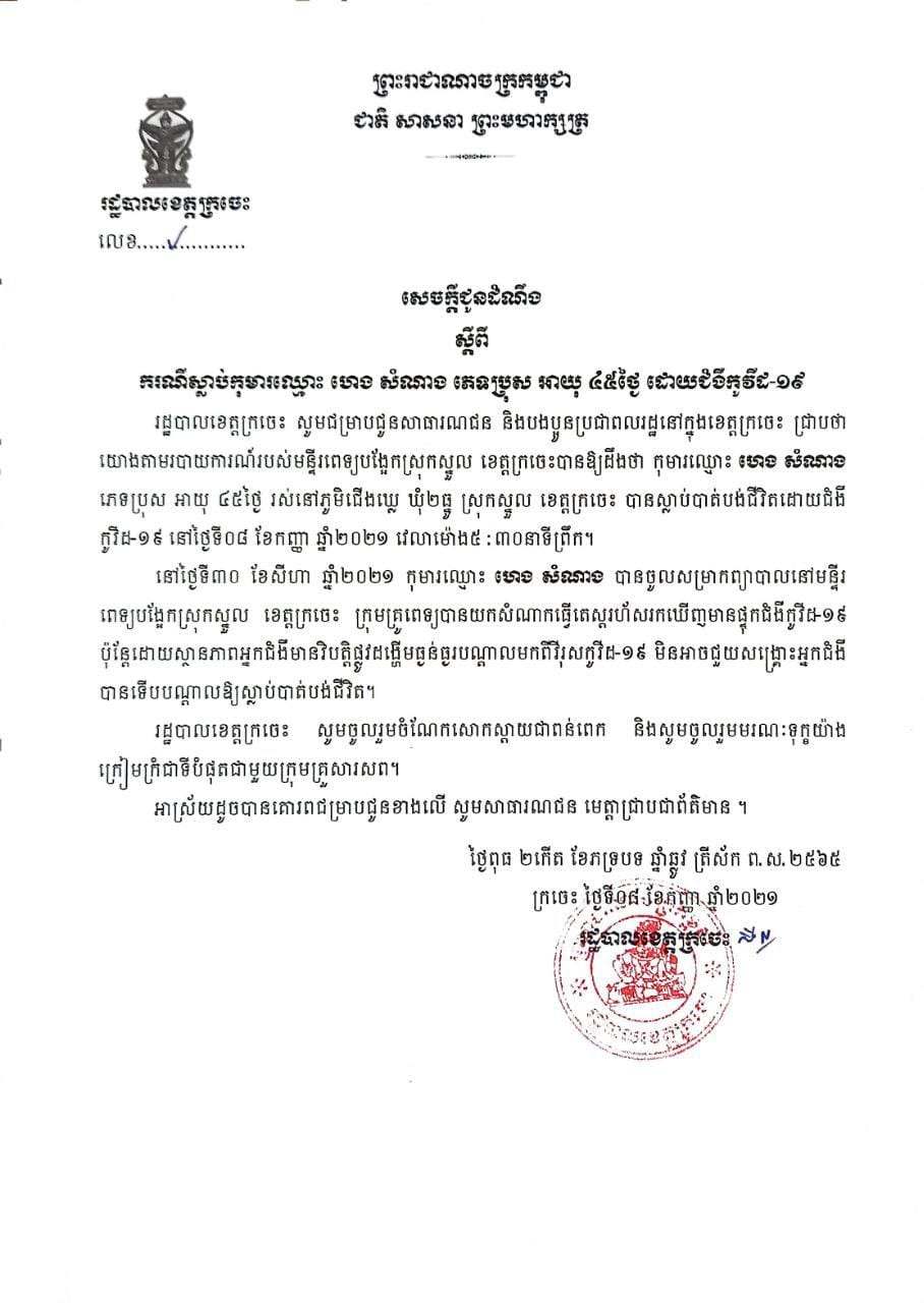 ខេត្តក្រចេះ៖ យោងតាមការចុះផ្សាយរបស់ រដ្ឋបាលខេត្តក្រចេះ បានចេញសេចក្តីជូនដំណឹងរបស់រដ្ឋបាលខេត្តក្រចេះ ស្ដីពីករណីស្លាប់ កុមារ ឈ្មោះហេង សំណាង ភេទប្រុស អាយុ ៤៥ថ្ងៃ ដោយសារជំងឺកូវីដ-១៩ នៅថ្ងៃទី០៨ ខែកញ្ញា ឆ្នាំ២០២១នេះ ដោយយោងតាមរបាយការណ៍របស់មន្ទីរពេទ្យបង្អែកស្រុកស្នួល ខេត្តក្រចេះបានឲ្យដឹងថា កុមារឈ្មោះ ហេង សំណាង រស់នៅភូមិជើងឃ្លេ ឃុំ២ធ្នូ ស្រុកស្នួល ខេត្តក្រចេះ បានស្លាប់បាត់បង់ជីវិតដោយជំងឺកូវីដ-១៩ នៅថ្ងៃទី០៨ ខែកញ្ញា ឆ្នាំ២០២១ វេលាម៉ោង ៥៖៣០ព្រឹក។