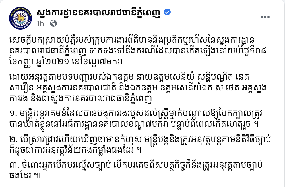 នាព្រឹកថ្ងៃទី០៩ ខែកញ្ញា ឆ្នាំ២០២១នេះ ស្នងការដ្ឋាននគរបាលរាជធានីភ្នំពេញ បានចេញសេចក្តីបកស្រាយបំភ្លឺរបស់ក្រុមការងារព័ត៌មាននិងប្រតិកម្មរហ័សនៃស្នងការដ្ឋាននគរបាលរាជធានីភ្នំពេញ ទាក់ទងទៅនឹងករណីដែលបានកើតឡើងនៅយប់ថ្ងៃទី០៨ ខែកញ្ញា ឆ្នាំ២០២១ នៅខណ្ឌ៧មករា ដោយអនុវត្តតាមបទបញ្ជារបស់ឯកឧត្តម នាយឧត្តមសេនីយ៍ សន្តិបណ្ឌិត នេត សាវឿន អគ្គស្នងការនគរបាលជាតិ និងឯកឧត្តម ឧត្តមសេនីយ៍ឯក ស ថេត អគ្គស្នងការរង និងជាស្នងការនគរបាលរាជធានីភ្នំពេញ