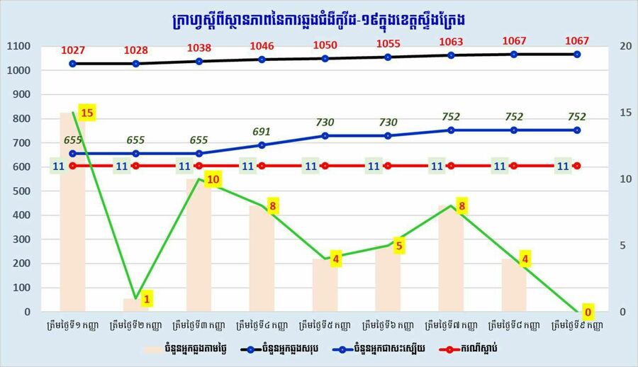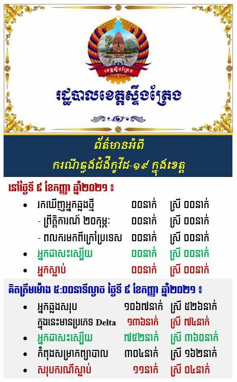 ខេត្តស្ទឹងត្រែងរកឃើញអ្នកជំងឺកូវីដ-១៩ ប្រភេទ Delta ម្នាក់ តែគ្មានអ្នកឆ្លងថ្មីទេនៅថ្ងៃទី៩ ខែកញ្ញានេះ