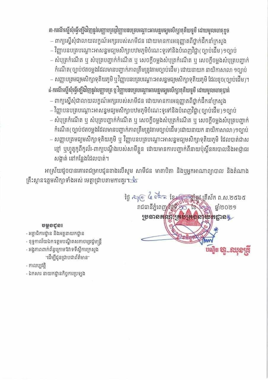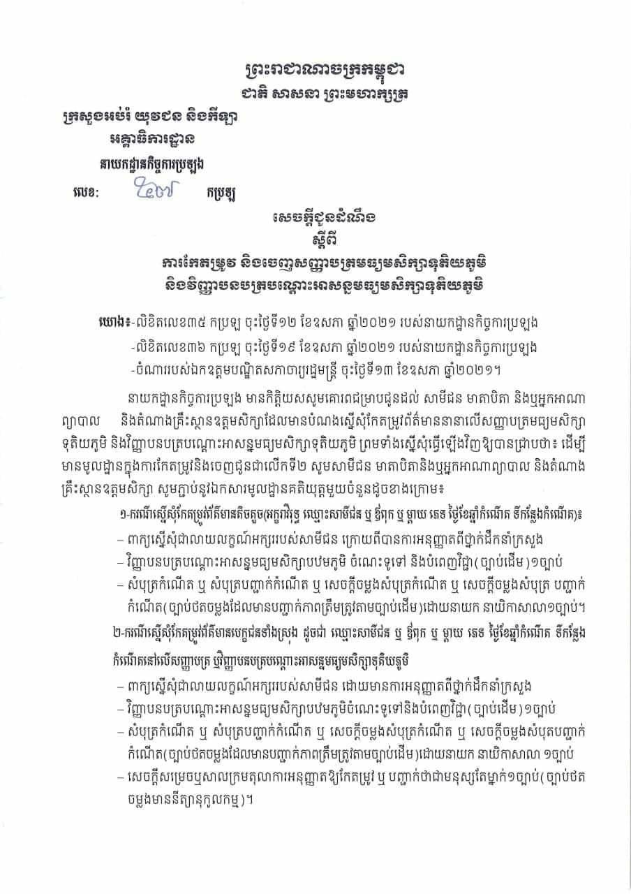 រាជធានីភ្នំពេញ៖ នៅថ្ងៃទី១១ ខែកញ្ញា ឆ្នាំ២០២១នេះ នាយកដ្ឋានកិច្ចការប្រឡង នៃក្រសួងអប់រំ យុវជន និងកីឡា បានចេញ សេចក្ដីជូនដំណឹង ស្ដីពីការកែតម្រូវ និងចេញសញ្ញាបត្រមធ្យមសិក្សាទុតិយភូមិ និងវិញ្ញាបនបត្របណ្ដោះអាសន្នមធ្យមសិក្សាទុតិយភូមិ។ សាមីជន មាតាបិតា និងឬអាណាព្យាបាល និងតំណាងគ្រឹះស្ថានឧត្តមសិក្សា ដែលមានបំណងស្នើសុំកែតម្រូវព័ត៌មាននានាលើសញ្ញាបត្រមធ្យមសិក្សាទុតិយភូមិ និងវិញ្ញាបនបត្របណ្តោះអាសន្នមធម្យសិក្សាទុតិយភូមិ សូមភ្ជាប់នូវឯកសារមូលដ្ឋានគតិយុត្តមួយចំនួនដូចខាងក្រោម៖