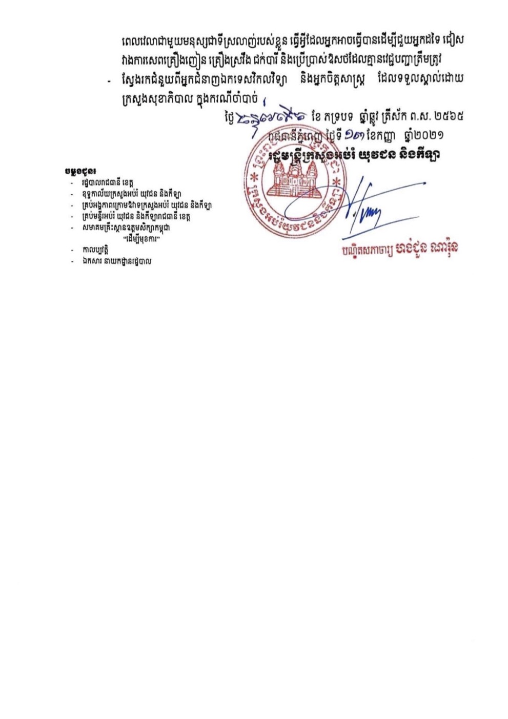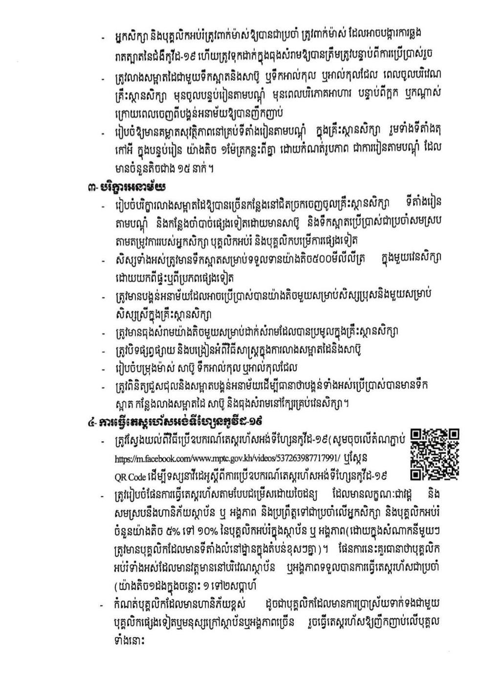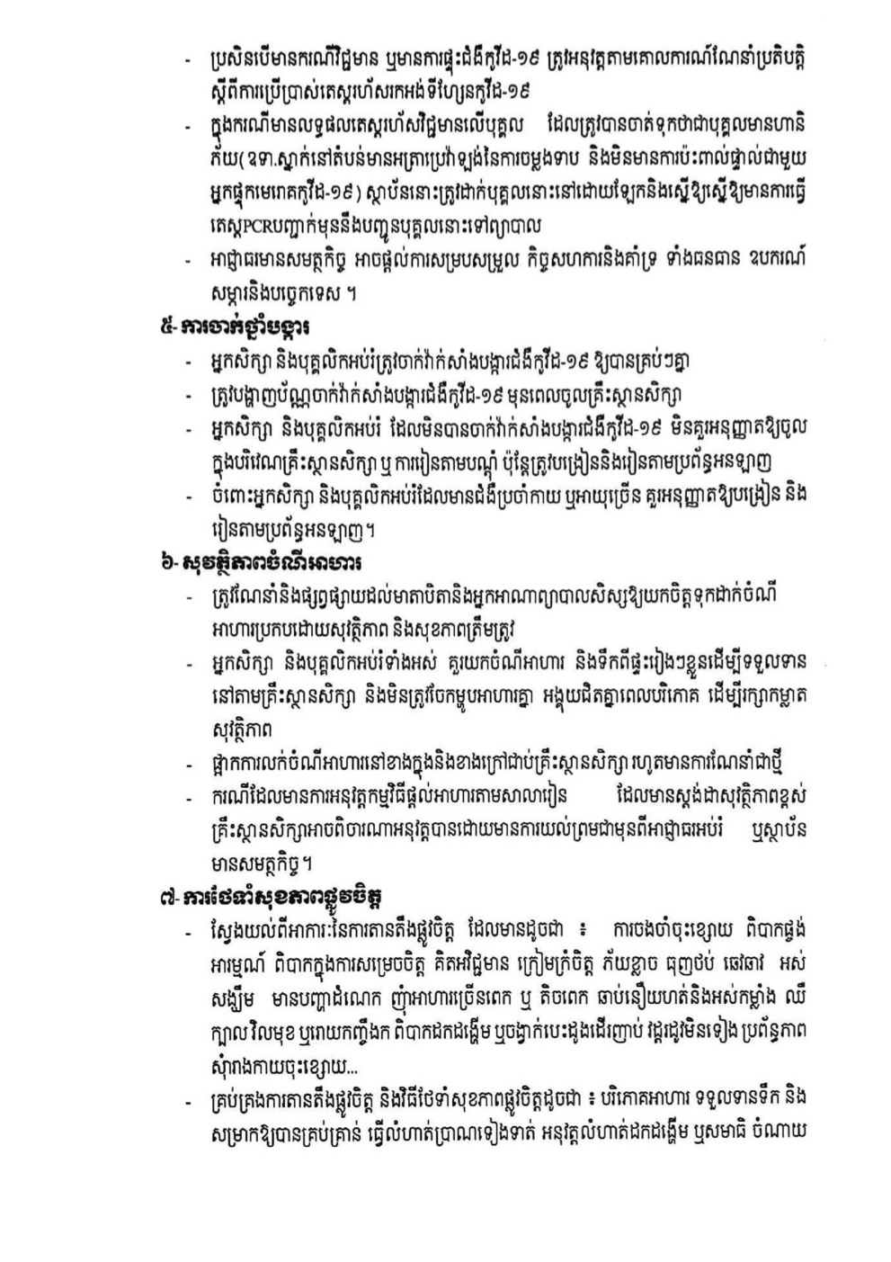 + ចំពោះអ្នកសិក្សា និងបុគ្គលិកអប់រំដែលមានជំងឺប្រចាំកាយ ឬអាយុច្រើន គួរអនុញ្ញាតឲ្យបង្រៀន និងរៀនតាមប្រព័ន្ធអនឡាញ