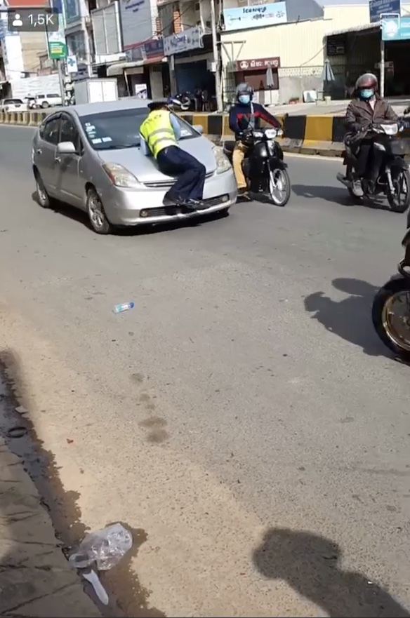 ស្នងការដ្ឋាននគរបាលរាជធានីភ្នំពេញធ្វើការបំភ្លឺ ករណីបុរសម្នាក់បេីកបរប៉ះសមត្ថកិច្ចជាប់នៅលេីដំបូលរថយន្ត (មានវីដេអូ)