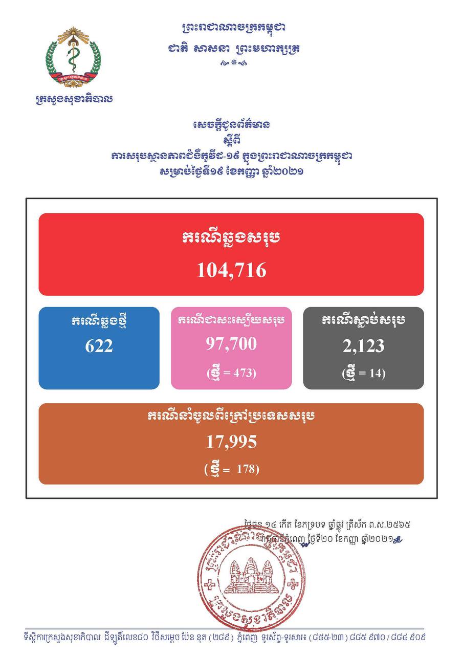 នៅថ្ងៃទី19 ខែកញ្ញា ឆ្នាំ2021នេះ ក្រសួងសុខាភិបាលកម្ពុជា បានចេញសេចក្តីជូនដំណឹងពី ការរកឃើញករណីវិជ្ជមានវីរុសកូវីដ១៩ថ្មី ចំនួន 622នាក់ ខណៈអ្នកបានជាសះស្បើយថ្មីមានចំនួន 473នាក់ និងមានអ្នកបាត់បង់ជីវិត 14នាក់។ គិតមកទល់ពេលនេះ ករណីឆ្លងកូវីដ១៩ សរុបនៅក្នុងប្រទេសកម្ពុជា មានចំនួន 104,716នាក់, ករណីជាសះស្បើយសរុប 97,700នាក់ និងស្លាប់សរុប 2,123នាក់៕