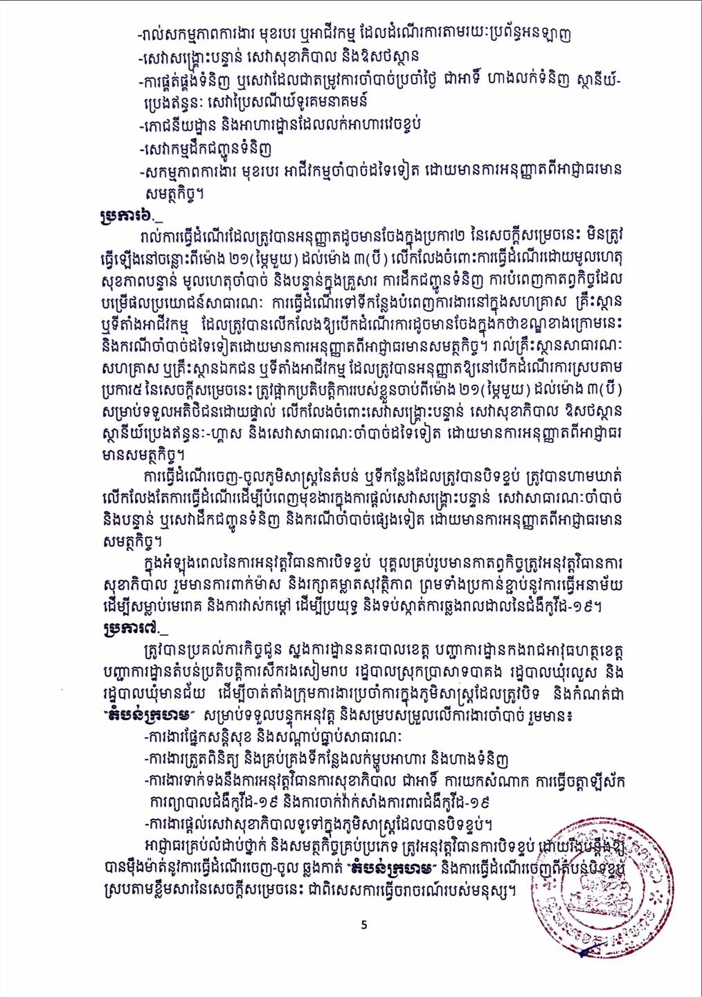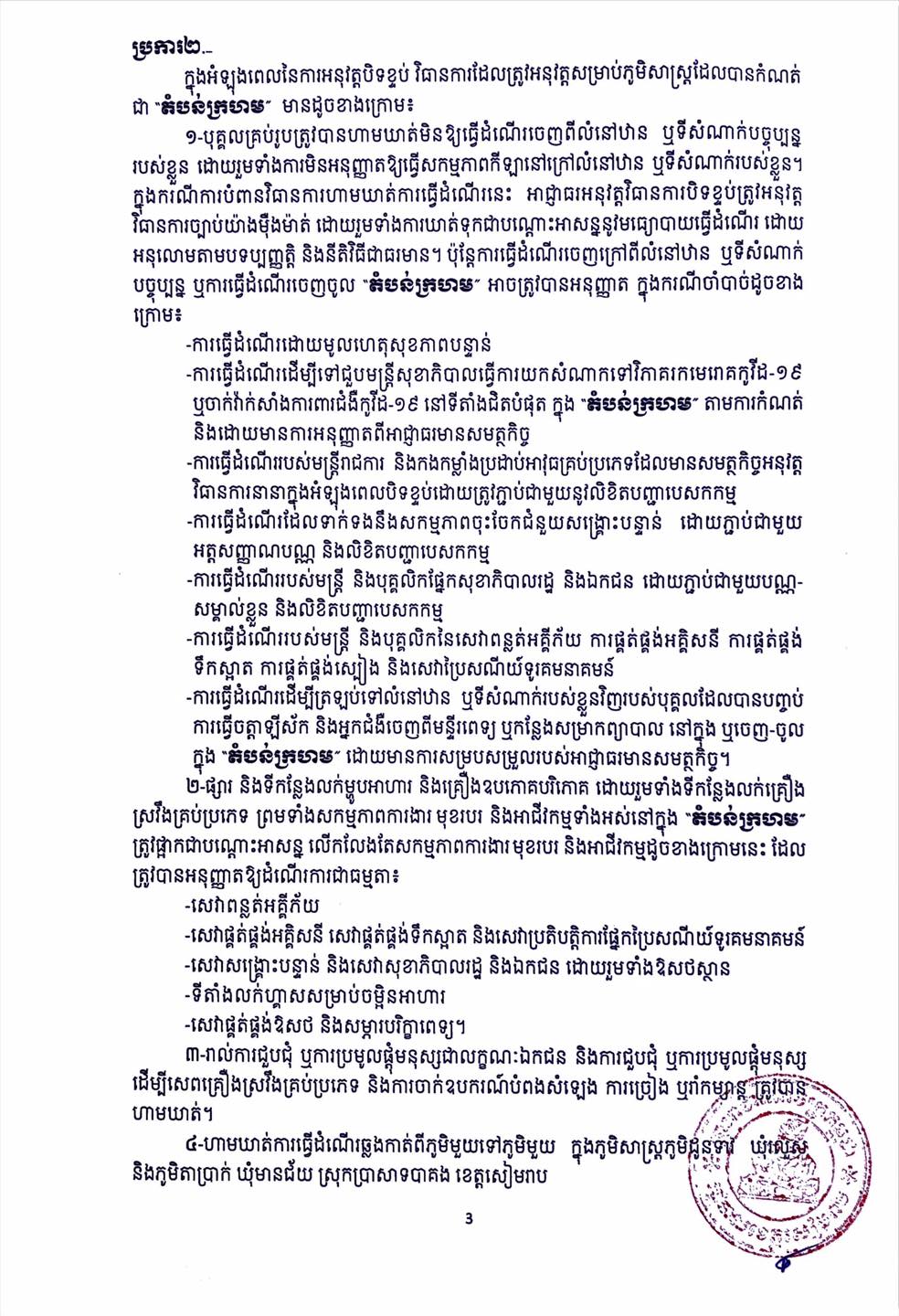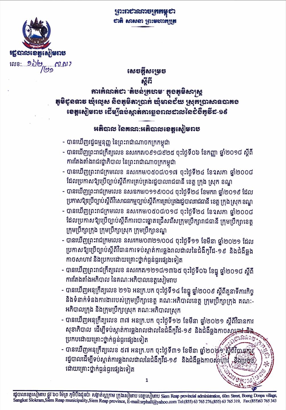 រដ្ឋបាលខេត្តសៀមរាប សម្រេចកំណត់ជាតំបន់ក្រហម នៅក្នុងភូមិសាស្ត្រភូមិដូនទាវ ឃុំរលួស និងភូមិតាប្រាក់ ឃុំមានជ័យ ស្រុកប្រាសាទបាគង ដែលជាតំបន់មានការរាលដាលនៃជំងឺកូវីដ-១៩ ជាបណ្តោះអាសន្នសម្រាប់រយៈពេល ១សប្តាហ៍ គិតចាប់ពីម៉ោង០១រសៀល ថ្ងៃទី២០ ដល់ថ្ងៃទី២៦ ខែកញ្ញា ឆ្នាំ២០២១ ក្នុងគោលបំណងធានាដល់ប្រសិទ្ធភាពនៃការគ្រប់គ្រងការឆ្លងរាលដាលនៃជំងឺកូវីដ-១៩ នៅក្នុងភូមិសាស្ត្រដែលត្រូវបិទ និងទប់ស្កាត់ជំងឺនេះមិនឱ្យឆ្លងរាលដាលទៅតំបន់ផ្សេងទៀត រហូតមានការចេញសេចក្ដីសម្រេចជាថ្មី។ ព័ត៌មានលម្អិត សូមអានសេចក្ដីសម្រេចខាងក្រោមនេះ៖