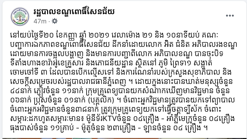 យោងតាមការបញ្ជាក់ពី រដ្ឋបាលខណ្ឌពោធិ៍សែនជ័យ បានឲ្យដឹងថា នៅយប់ថ្ងៃទី២០ ខែកញ្ញា ឆ្នាំ ២០២១ វេលាម៉ោង ២១ និង ១០នាទីយប់ គណៈបញ្ជាការឯកភាពខណ្ឌពោធិ៍សែនជ័យ ដឹកនាំដោយលោក អ៉ិត ជំនិត អភិបាលរងខណ្ឌ ដោយមានការចង្អុលបង្ហាញ និងមានការបញ្ជាពីលោក អភិបាលខណ្ឌ បានចុះបិទទីតាំងហាងខារ៉ាអូខេគ្រួសារ និងភោជនីយដ្ឋាន ស្ថិតនៅ ភូមិ ព្រៃទា១ សង្កាត់ចោមចៅទី ៣ ដែលបានបេីកល្មេីសទៅ និងការណែនាំរបស់ក្រសួងសុខាភិបាល និងសេចក្តីសម្រេចរបស់រដ្ឋបាលរាជធានីភ្នំពេញ។