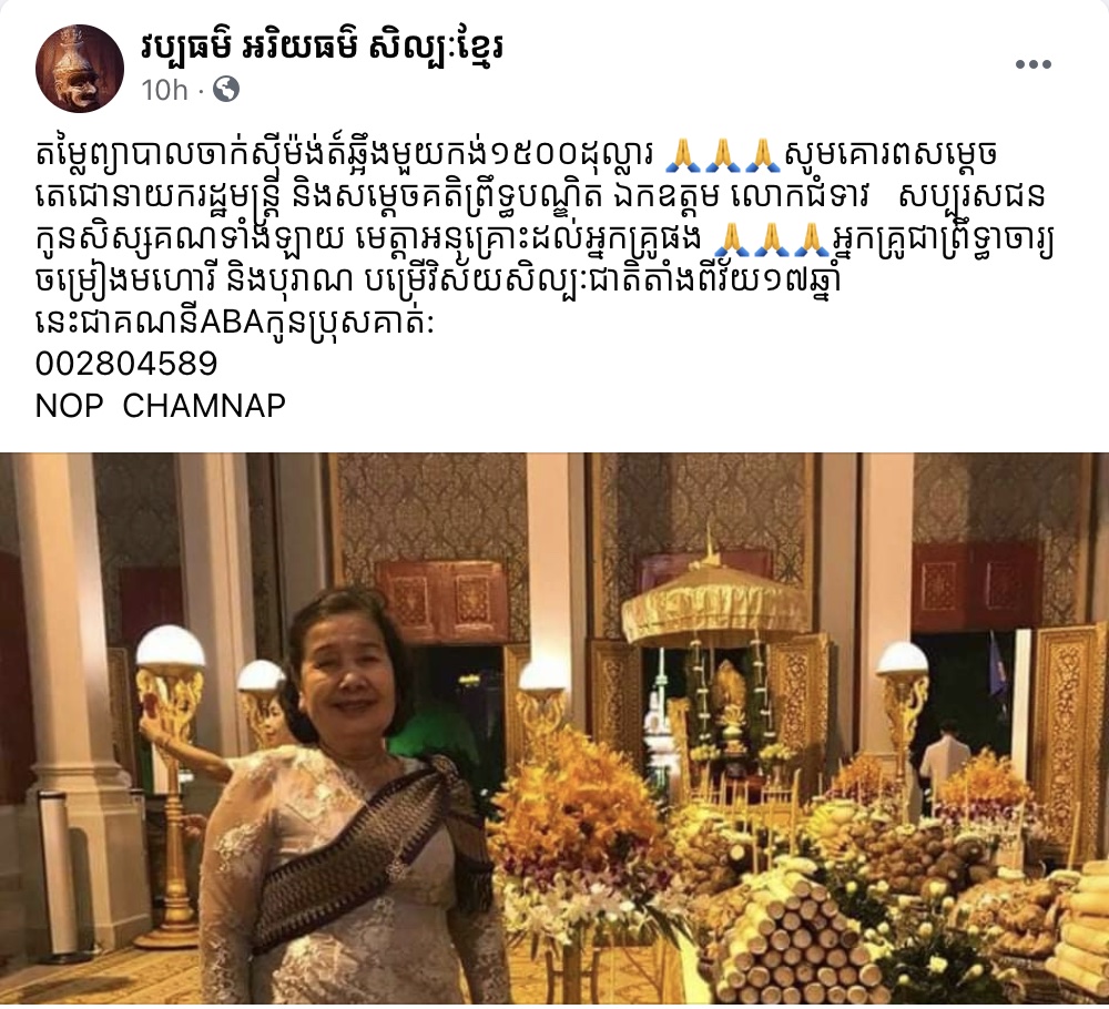 ចំណែកឯទំព័រហ្វេសប៊ុក វប្បធម៌ អរិយធម៌ សិល្បៈខ្មែរ បានឲ្យដឹងថា “តម្លៃព្យាបាលចាក់ស៊ីម៉ង់ត៍ឆ្អឹងមួយកង់១៥០០ដុល្លារ 🙏🙏🙏សូមគោរពសម្ដេចតេជោនាយករដ្ឋមន្រ្តី និងសម្ដេចគតិព្រឹទ្ធបណ្ឌិត ឯកឧត្តម លោកជំទាវ សប្បុរសជនកូនសិស្សគណទាំងឡាយ មេត្តាអនុគ្រោះដល់អ្នកគ្រូផង 🙏🙏🙏អ្នកគ្រូជាព្រឹទ្ធាចារ្យចម្រៀងមហោរី និងបុរាណ បម្រើវិស័យសិល្បៈជាតិតាំងពីវ័យ១៧ឆ្នាំ នេះជាគណនីABAកូនប្រុសគាត់: 002804589 NOP CHAMNAP”
