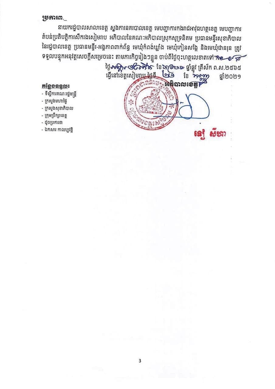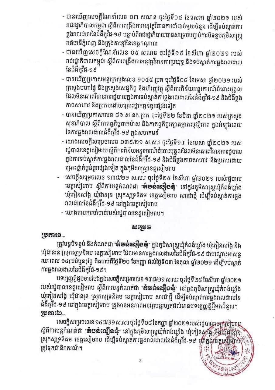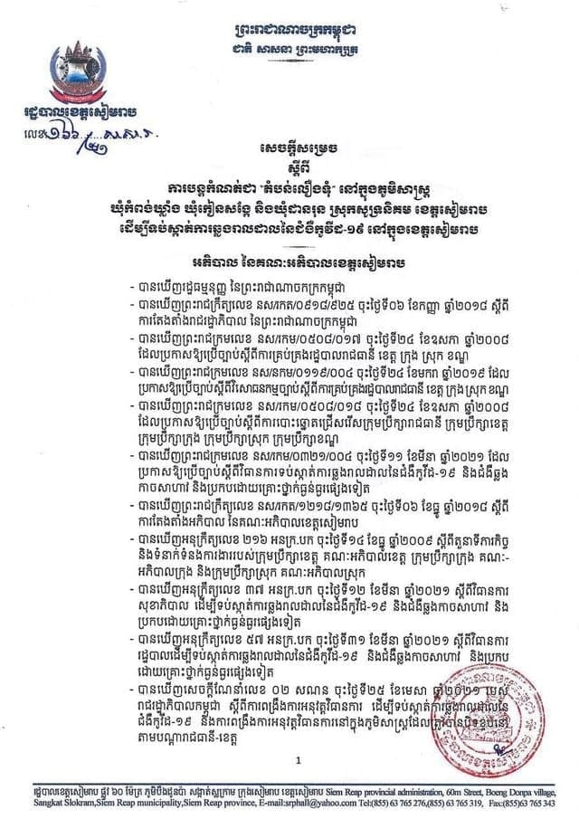 រដ្ឋបាលខេត្តសៀមរាប បានចេញសេចក្តីសម្រេចបន្តបិទខ្ទប់ និងកំណត់ជា “តំបន់លឿងទុំ” ក្នុងភូមិសាស្ត្រឃុំកំពង់ឃ្លាំង , ឃុំកៀនសង្កែ និង ឃុំដានរុន ក្នុងស្រុកសូទ្រនិគម ដែលជាទីតាំងមានការឆ្លងរាលដាលជំងឺកូវីដ-១៩ ជាបណ្តោះអាសន្នសម្រាប់រយៈពេល ១៤ថ្ងៃ គិតចាប់ពីថ្ងៃទី២០ ខែកញ្ញា ដល់ថ្ងៃទី០៣ ខែតុលា ឆ្នាំ២០២១ ដើម្បីទប់ស្កាត់ការឆ្លងរាលដាលនៃជំងឺកូវីដ-១៩។ ព័ត៌មានលម្អិត សូមអានសេចក្ដីសម្រេចខាងក្រោមនេះ៖
