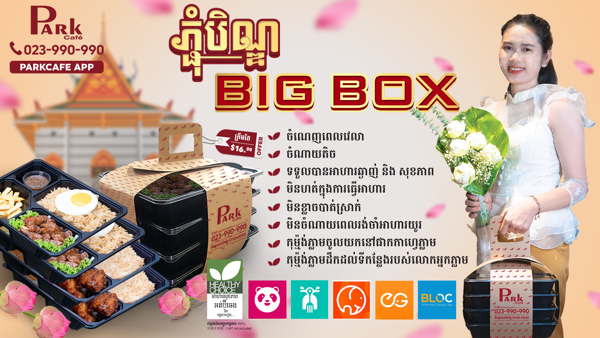 ស្របពេលរដូវកាលកាន់បិណ្ឌ និង ភ្ជុំបិណ្ឌរបស់ប្រជាជនកម្ពុជាបានចូលមកដល់ភ្លាម ពីភោជនីយដ្ឋានផាកកាហ្វេ បាននាំនូវ ឈុតអាហារ BIG BOX ដែលផ្តល់ភាពងាយស្រួលខ្លាំងជូនអតិថិជនទាំងអស់។ គួរបញ្ជាក់ផងដែរថា សម្រាប់ ឈុតអាហារ BIG BOX គឺបានជួយសម្រួលខ្លាំង និងចំណាយតិច ចំណេញពេលវេលាច្រើនគួរសម បើធៀបជាមួយការចម្អិនម្ហូបនៅផ្ទះផ្ទាល់ ទទួលបានអាហារឆ្ងាញ់ និង សុខភាពមានអនាម័យ ជាមួយសោភ័ណភាព មិនហត់ក្នុងការធ្វើអាហារ មិនខ្លាចបាត់ស្រាក់ ដែលបងប្អូននារីភាពច្រើនគឺតែងតែជួបនៅបញ្ហានេះ មិនចំណាយពេលរង់ចាំអាហារយូរ កុម្ម៉ងភ្លាមចូលយកនៅផាកកាហ្វេភ្លាមនៅសាខាដែលនៅជិះផ្ទះរបស់លោកអ្នក ឬនៅតាមផ្លូវទៅវត្ត អាចកុម្ម៉ងភ្លាមដឹកដល់ទីកន្លែងរបស់លោកភ្លាម តាមរយៈលេខ ០២៣ ៩៩០ ៩៩០។