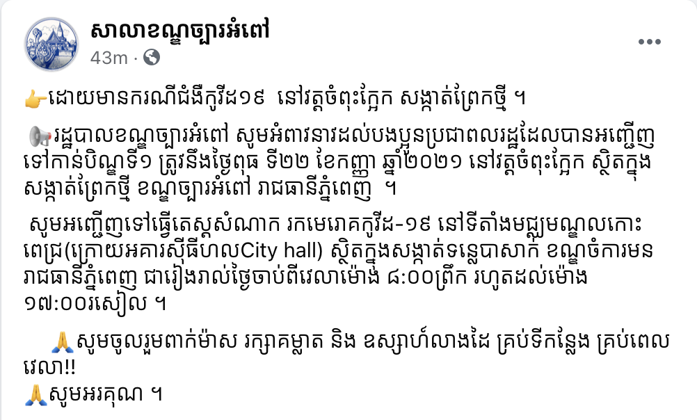 ថ្ងៃកាន់បិណ្ឌទី១ អ្នកបានទៅវត្តចំពុះក្អែក សូមប្រញាប់ទៅធ្វើតេស្តសំណាក ដោយសារមានករណីជំងឺកូវីដ-១៩ នៅវត្តនេះ