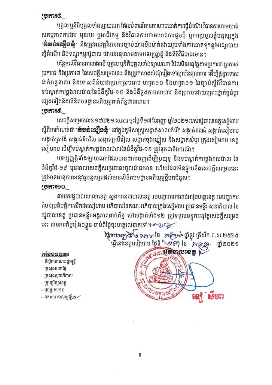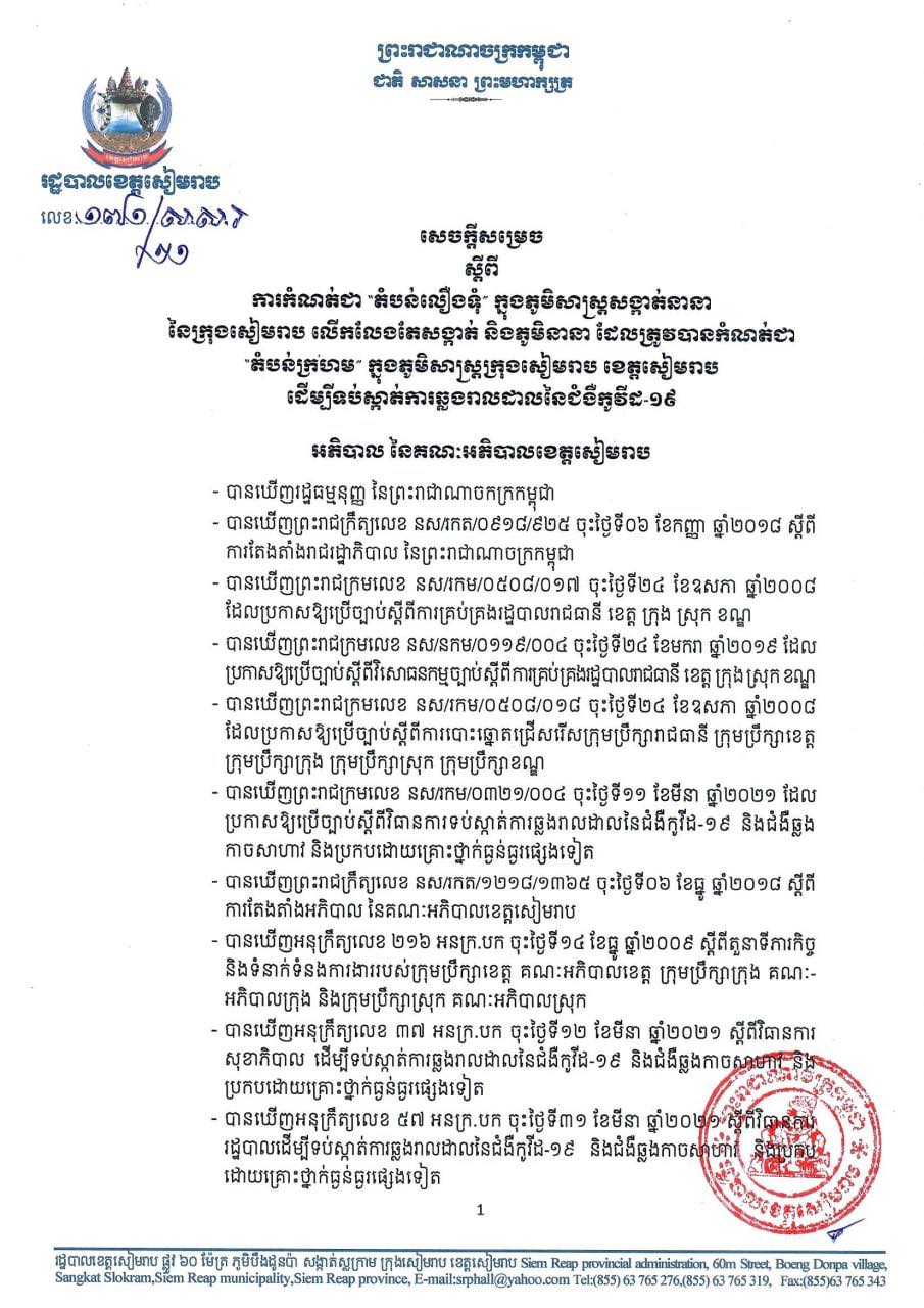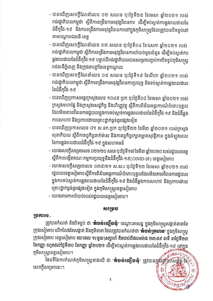 ដោយរដ្ឋបាលខេត្តសៀមរាប ត្រូវបានកំណត់ និងបិទខ្ទប់ជា “តំបន់លឿងទុំ” បណ្ដោះអាសន្ន ក្នុងភូមិសាស្ត្រសង្កាត់នានានៃក្រុងសៀមរាប លើកលែងតែសង្កាត់ និងភូមិនានា ដែលត្រូវបានកំណត់ជា “តំបន់ក្រហម” ក្នុងខេត្តសៀមរាប ដែលមានរយៈពេល ១(មួយ)សប្តាហ៍ គិតចាប់ពីវេលាម៉ោង ២៣៖៥៩នាទី នាថ្ងៃទី២៣ ខែកញ្ញា រហូតដល់ថ្ងៃទី៣០ ខែកញ្ញា ឆ្នាំ២០២១ ដើម្បីទប់ស្កាត់ការឆ្លងរាលដាលនៃជំងឺកូវីដ-១៩ នៅក្នុង ភូមិសាស្ត្រខេត្តសៀមរាប ៕
