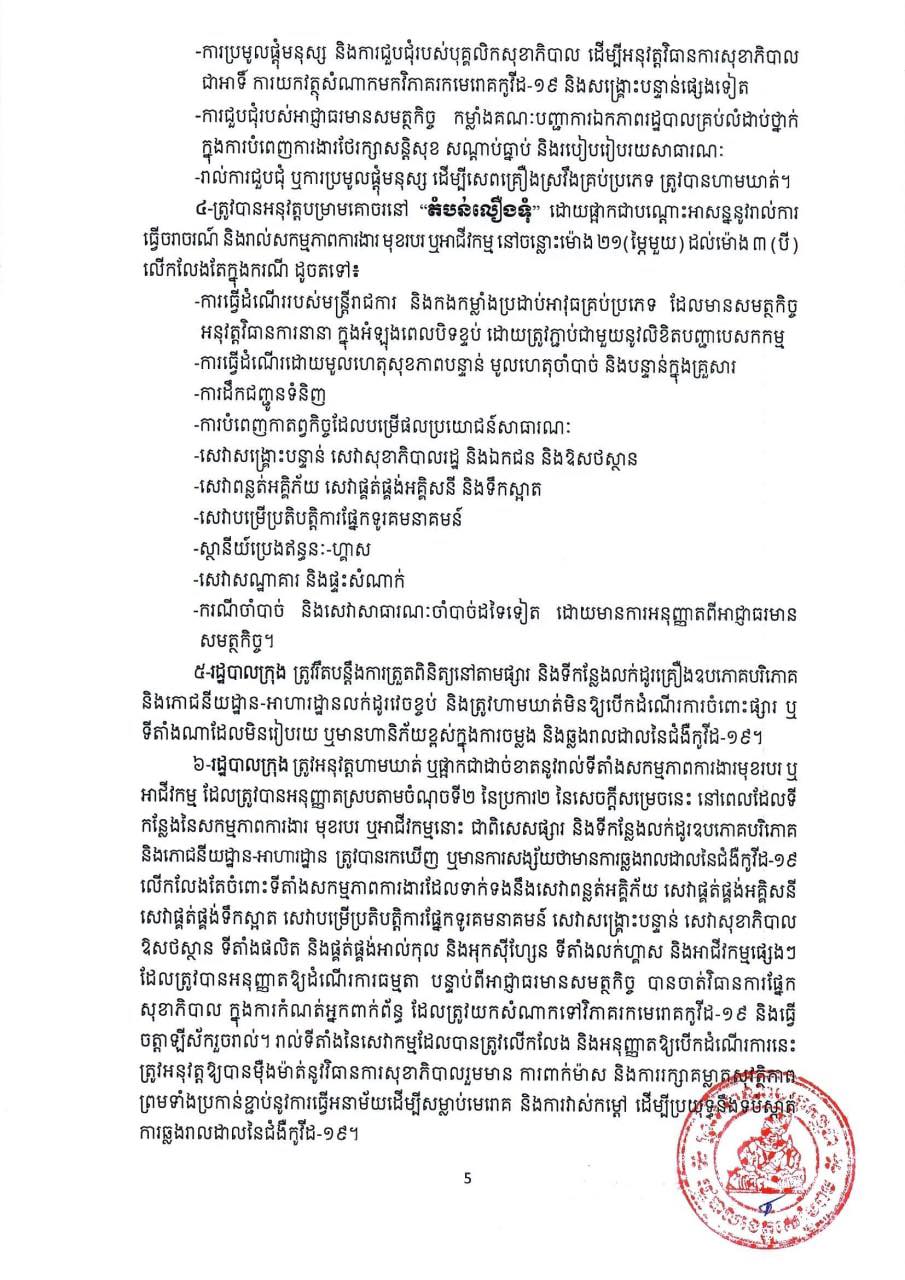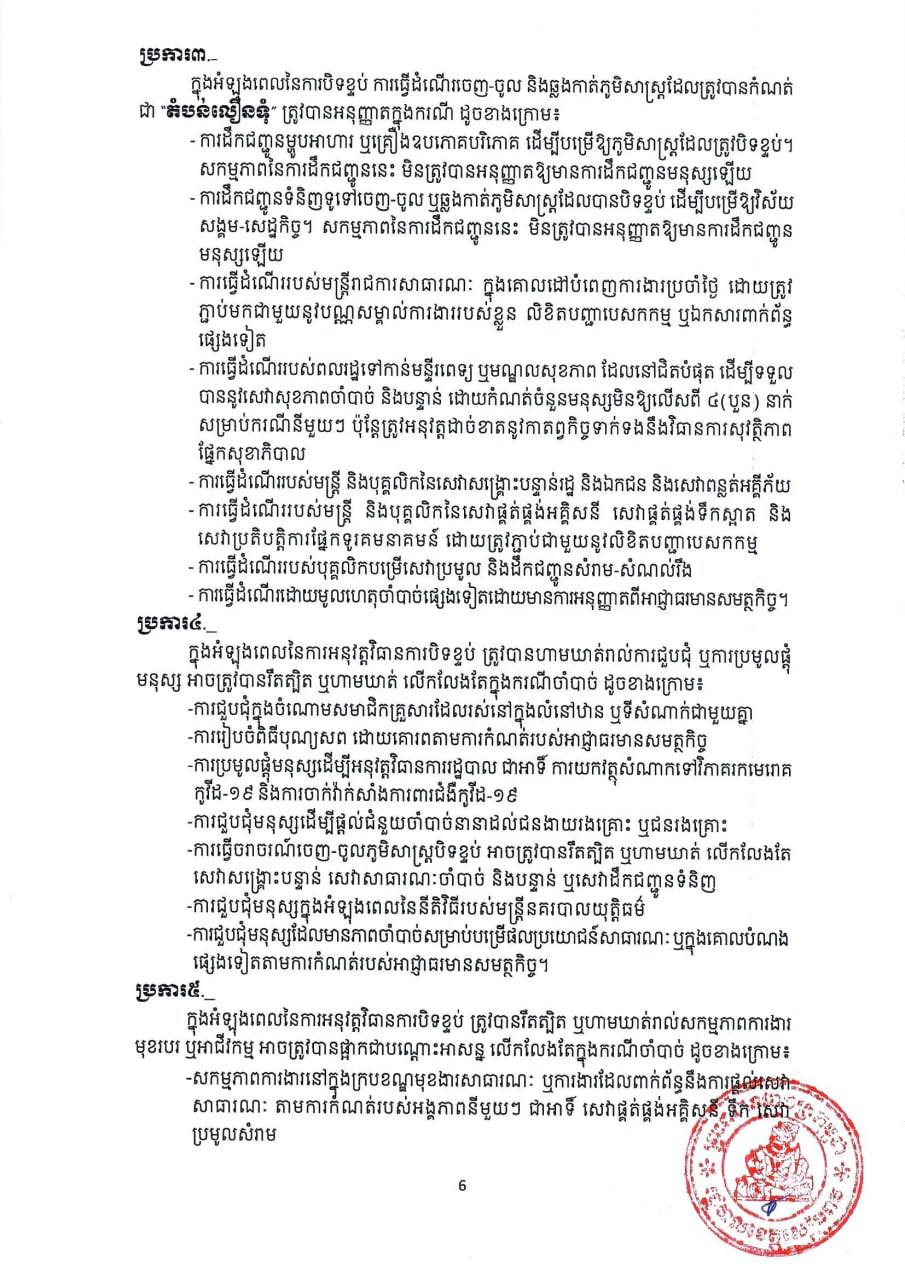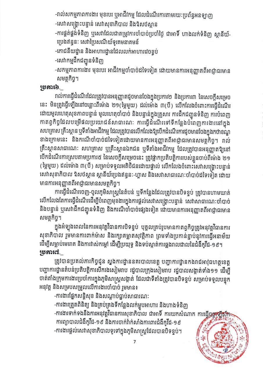 ដោយរដ្ឋបាលខេត្តសៀមរាប ត្រូវបានកំណត់ និងបិទខ្ទប់ជា “តំបន់លឿងទុំ” បណ្ដោះអាសន្ន ក្នុងភូមិសាស្ត្រសង្កាត់នានានៃក្រុងសៀមរាប លើកលែងតែសង្កាត់ និងភូមិនានា ដែលត្រូវបានកំណត់ជា “តំបន់ក្រហម” ក្នុងខេត្តសៀមរាប ដែលមានរយៈពេល ១(មួយ)សប្តាហ៍ គិតចាប់ពីវេលាម៉ោង ២៣៖៥៩នាទី នាថ្ងៃទី២៣ ខែកញ្ញា រហូតដល់ថ្ងៃទី៣០ ខែកញ្ញា ឆ្នាំ២០២១ ដើម្បីទប់ស្កាត់ការឆ្លងរាលដាលនៃជំងឺកូវីដ-១៩ នៅក្នុង ភូមិសាស្ត្រខេត្តសៀមរាប ៕