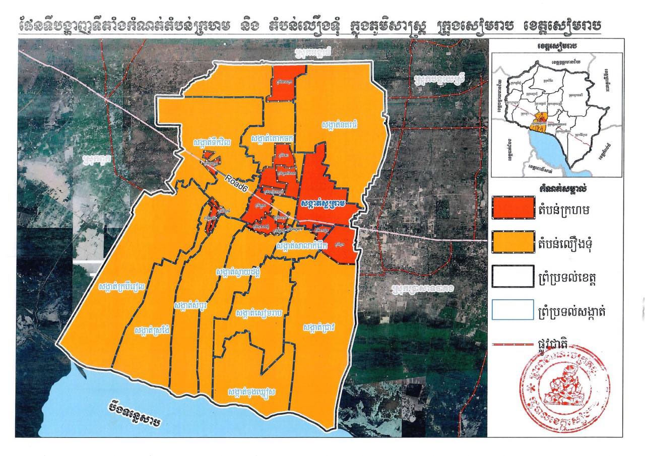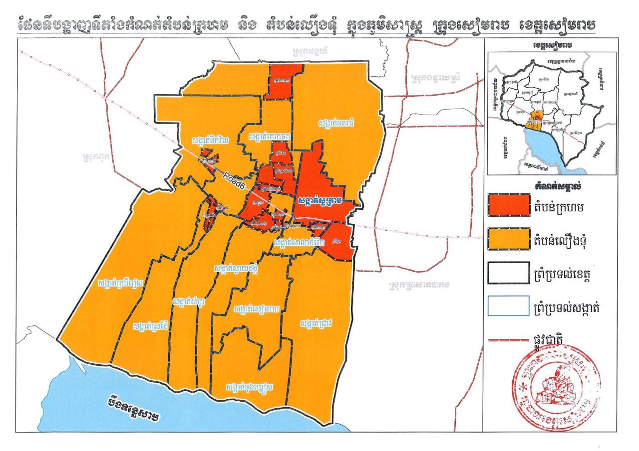 រដ្ឋបាលខេត្តសៀមរាប សម្រេចកំណត់ “តំបន់លឿងទុំ” ក្នុងភូមិសាស្ត្រសង្កាត់នានា ក្រុងសៀមរាប លើកលែងតែសង្កាត់ ដែលត្រូវបានកំណត់ជា “តំបន់ក្រហម”
