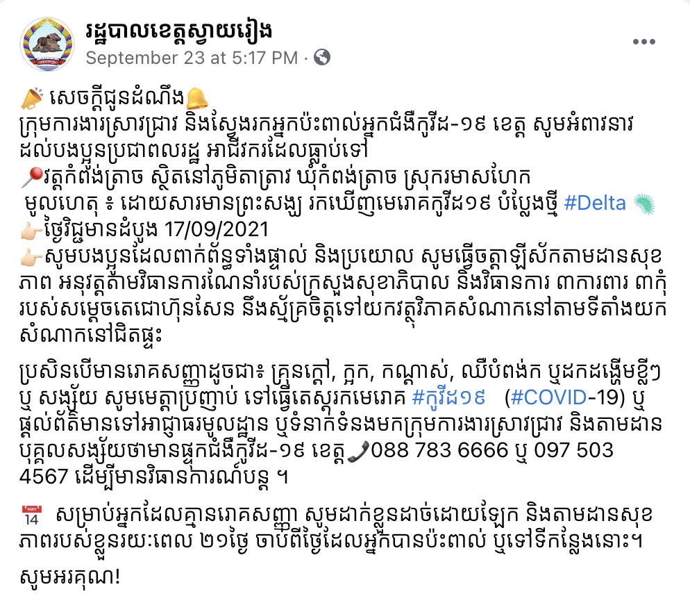នៅថ្ងៃទី២៣ ខែកញ្ញា ឆ្នាំ២០២១ កន្លងទៅនេះ រដ្ឋបាលខេត្តស្វាយរៀង បានធ្វើការប្រកាសថា នៅវត្តកំពង់ត្រាច ស្ថិតនៅភូមិតាត្រាវ ឃុំកំពង់ត្រាច ស្រុករមាសហែក ក្រុមគ្រូពេទ្យបានរកឃើញមានករណី មានព្រះសង្ឃ វិជ្ជមានមេរោគកូវីដ១៩ បំប្លែងថ្មី Delta តាំងពីថ្ងៃទី១៧ ខែកញ្ញា ឆ្នាំ២០២១មកម្ល៉េះ។