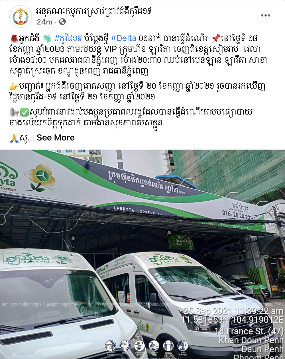 យោងតាមការប្រកាសព័ត៌មានរបស់អនុគណៈកម្មការស្រាវជ្រាវជំងឺកូវីដ១៩ បានអោយដឹងថា អ្នកជំងឺ កូវីដ១៩ បំប្លែងថ្មី Delta ០១នាក់ បានធ្វើដំណើរ នៅថ្ងៃទី ១៨ ខែកញ្ញា ឆ្នាំ២០២១ តាមរថយន្ត VIP ក្រុមហ៊ុន ឡារីតា ចេញពីខេត្តសៀមរាប វេលាម៉ោង១៤:០០ មកដល់រាជធានីភ្នំពេញ ម៉ោង២០:៣០ ឈប់នៅបេនឡាន ឡារីតា សាខាសង្កាត់ស្រះចក ខណ្ឌដូនពេញ រាជធានីភ្នំពេញ។